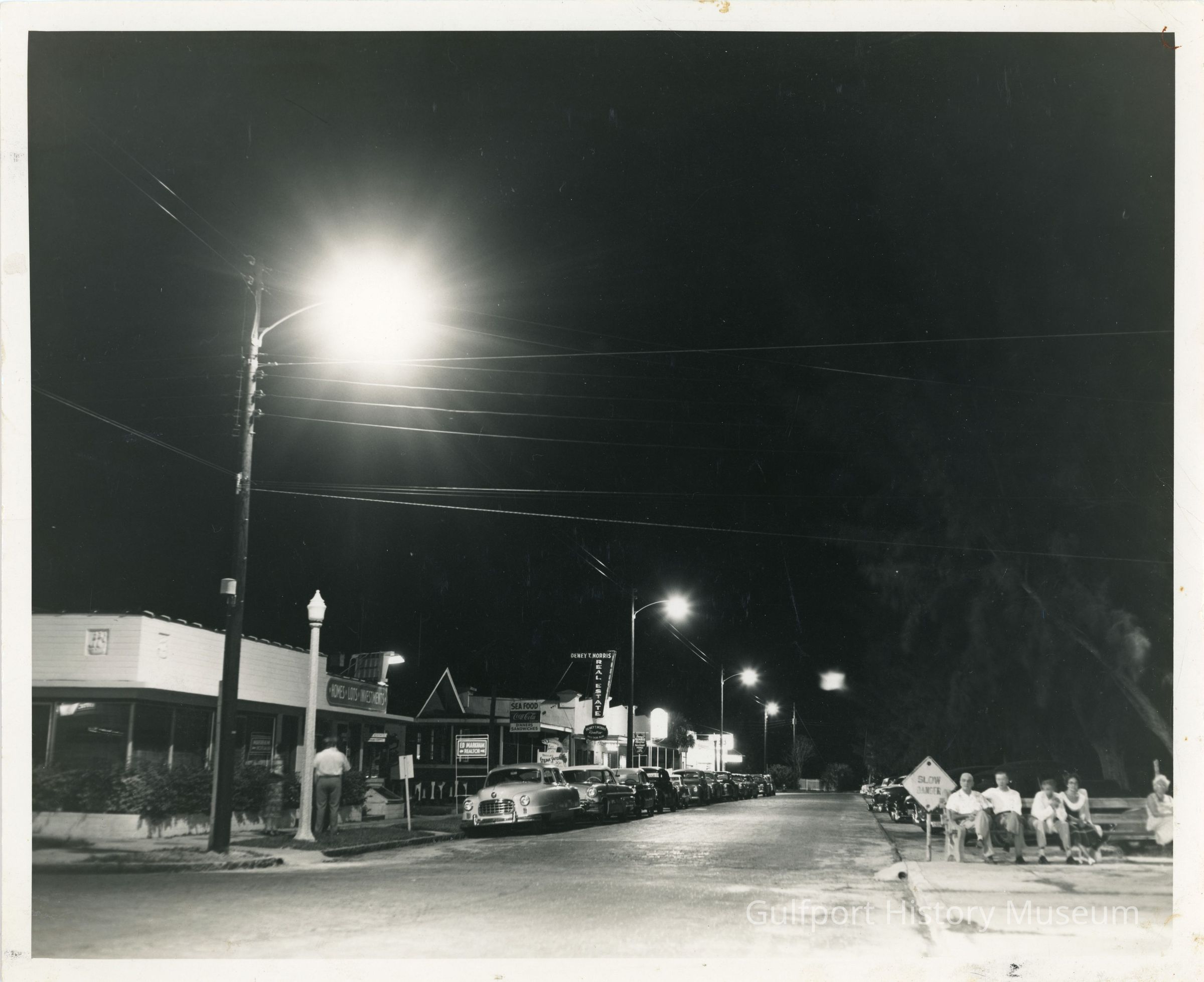A black and white photograph of Shore Blvd at night. There are five people sitting on a bench facing the camera. The street lights are all on. There are palm trees on the right side of the street by Gulfport Beach. Parked cars line the street on the left near the buildings. There are signs for Markham Realty, Dewey T. Morris Real Estate, and a seafood restaurant. A man stands outside the Markham office.