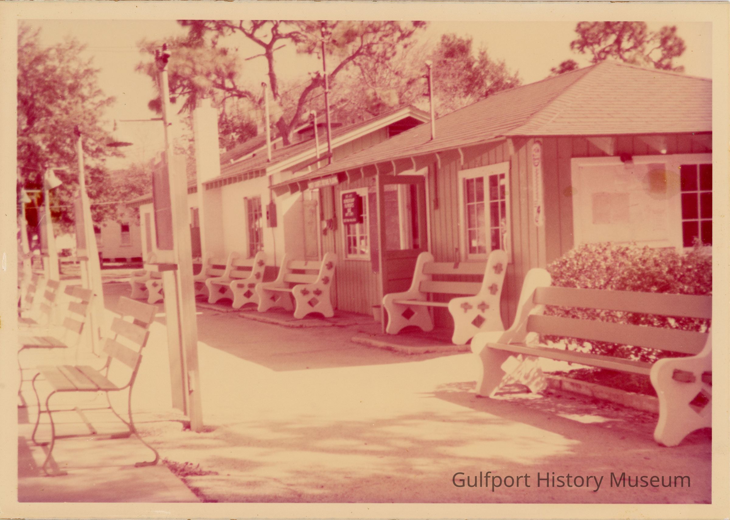 A color photograph of the shuffleboard clubhouse (later the Gulfport Arts Center) at 2726 54th St S. Benches line the clubhouse and the courts, which are just out of frame.