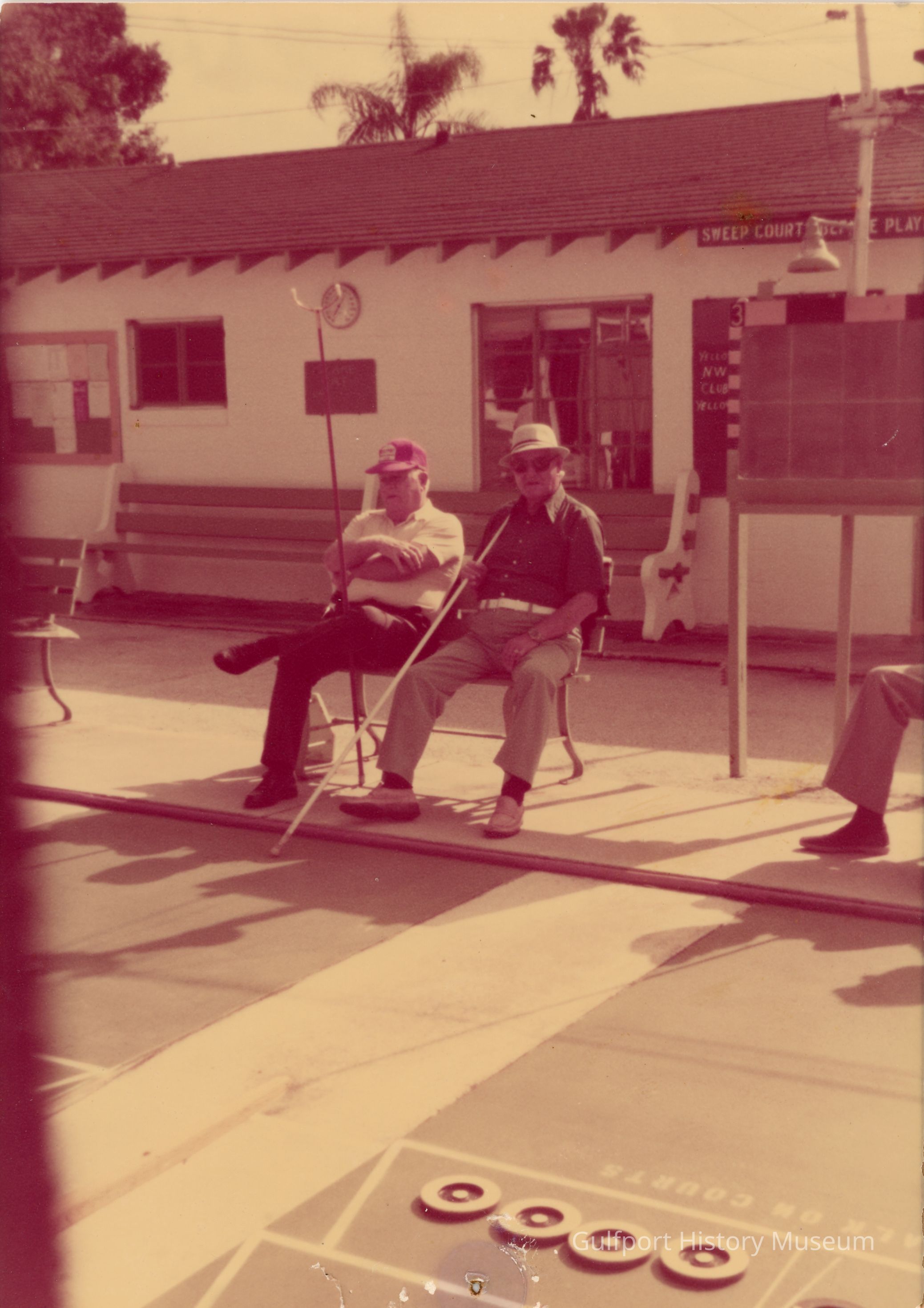 A color photograph of the shuffleboard courts formerly located near 2726 54th St S. Two men sit on a small bench at the courts and hold cues. The clubhouse (later the Gulfport Arts Center) can be seen behind them.