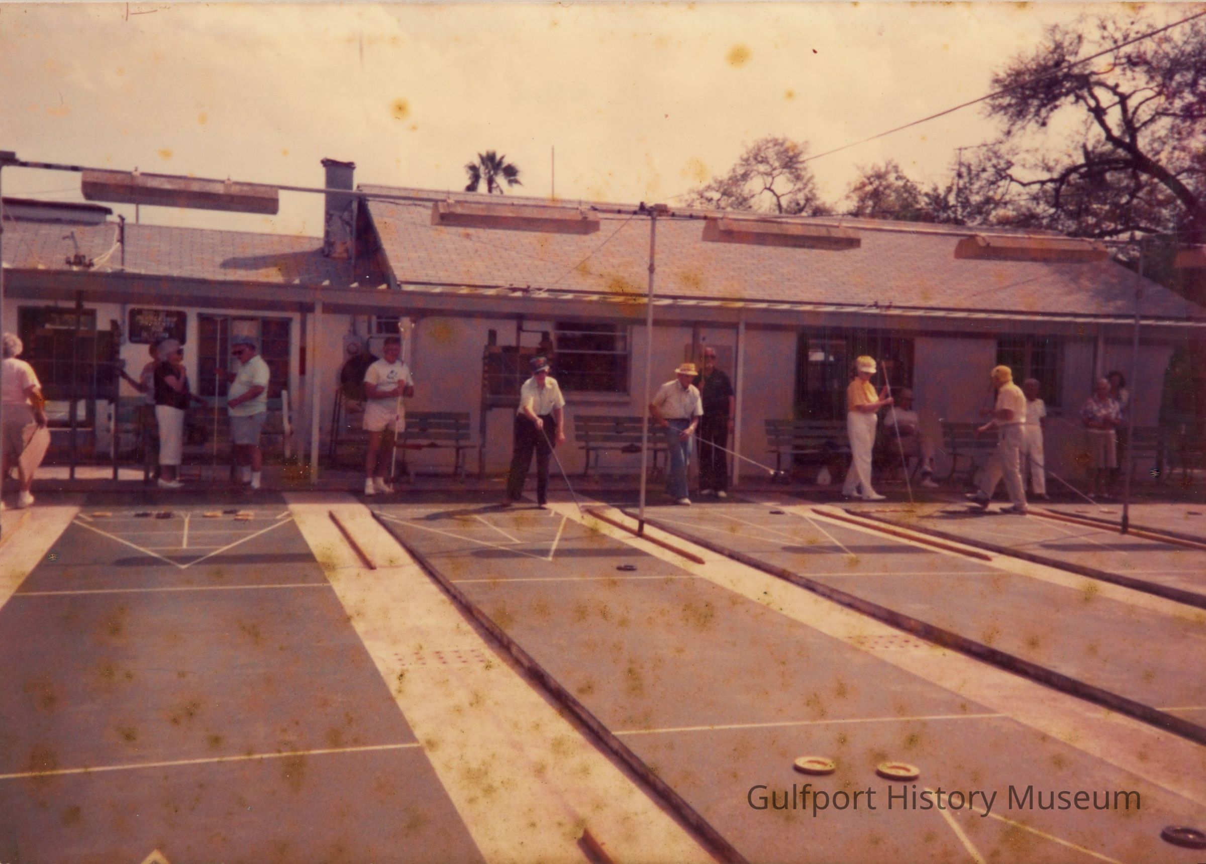 A color photograph of the shuffleboard courts formerly located near 2726 54th St S. People surround the courts with cues. The clubhouse (later the Gulfport Arts Center) is behind them.