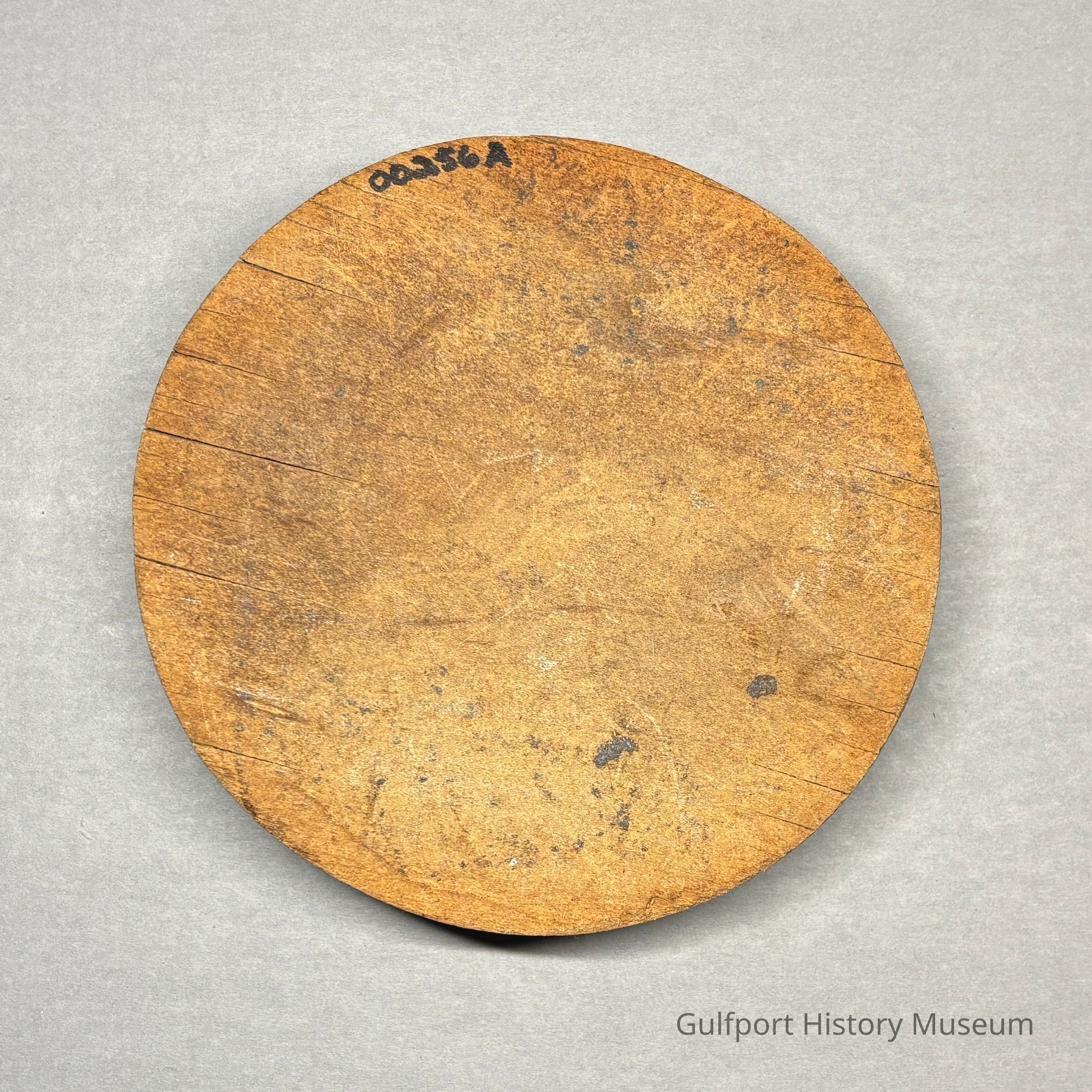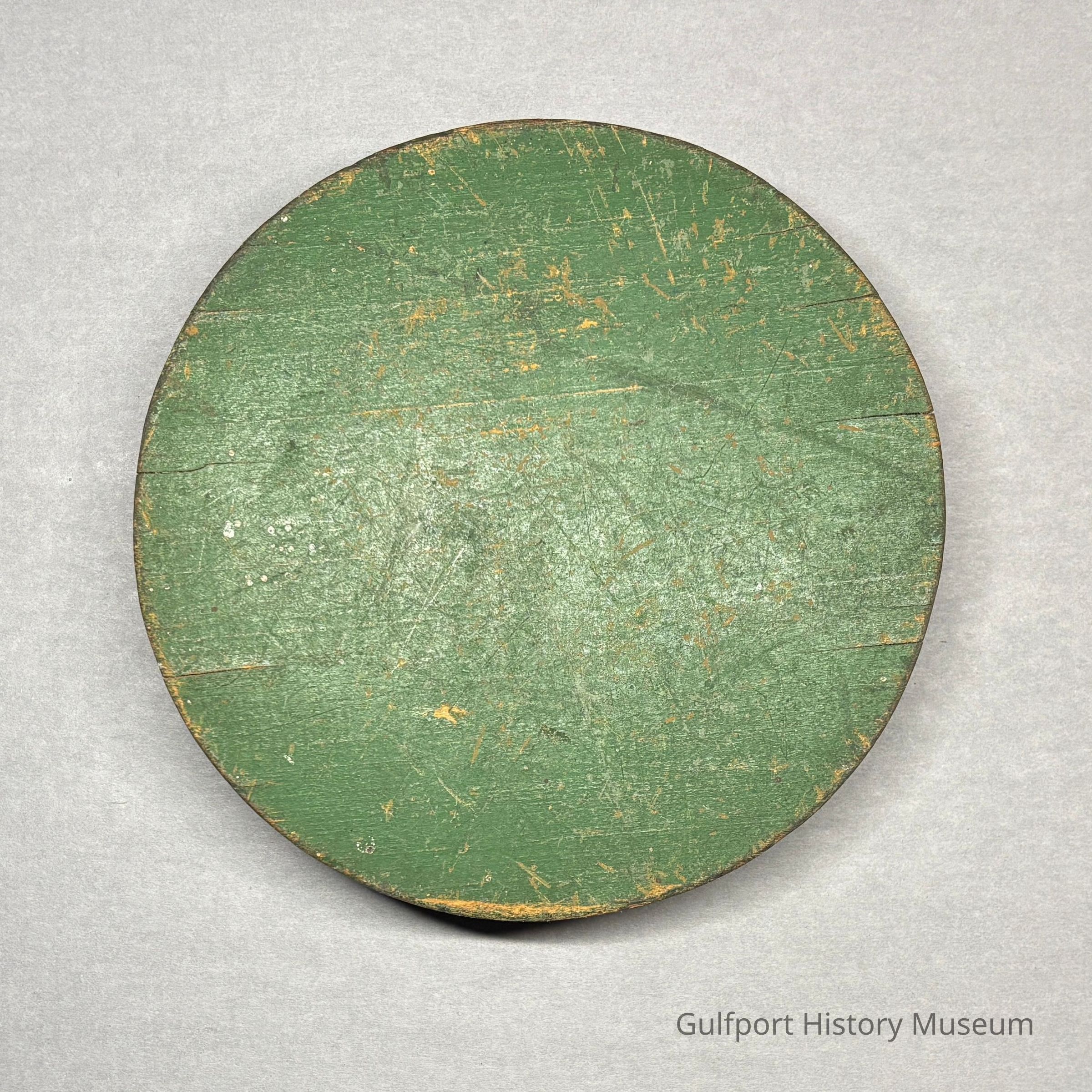 A green wooden [shuffleboard disc from the Gulfport Shuffleboard Club].