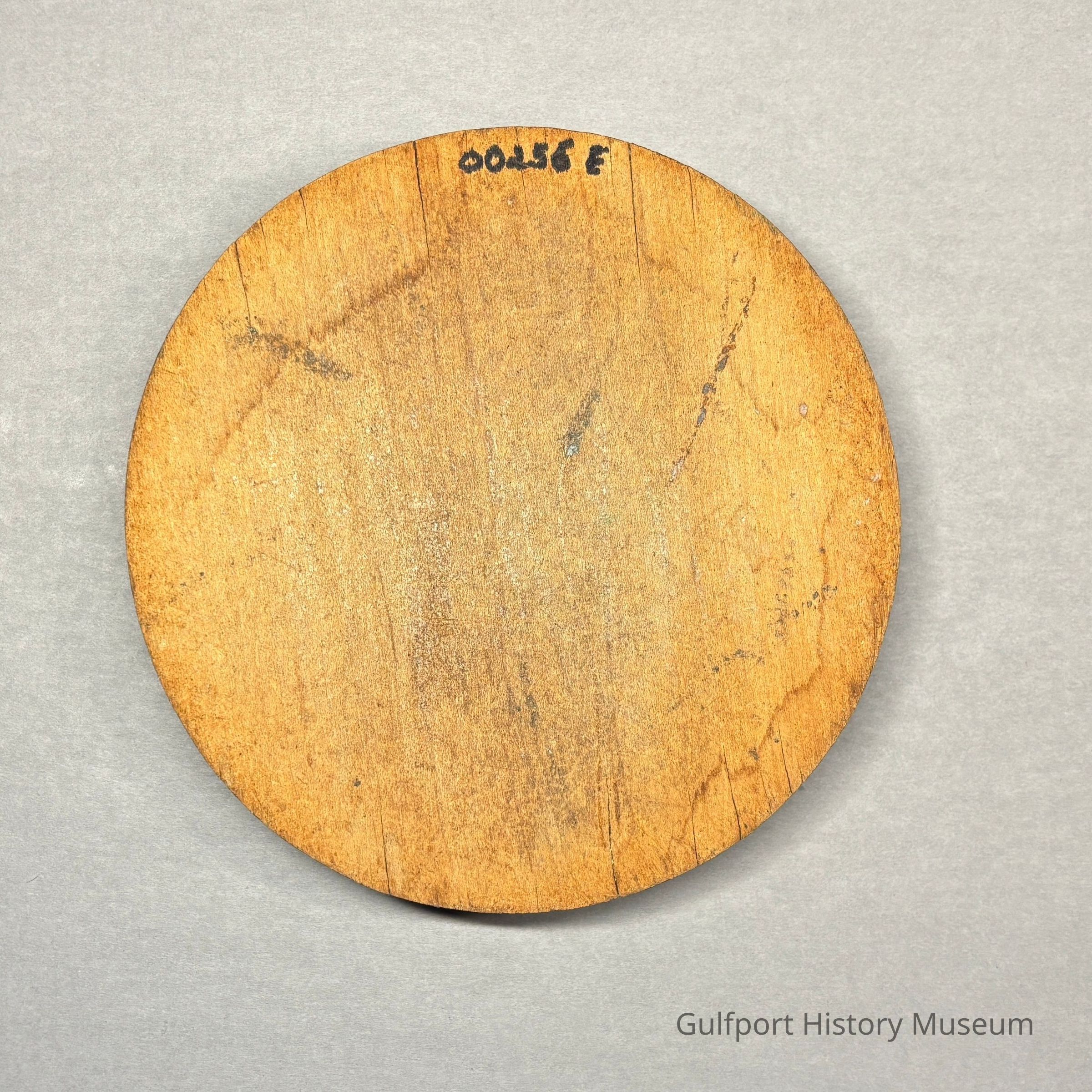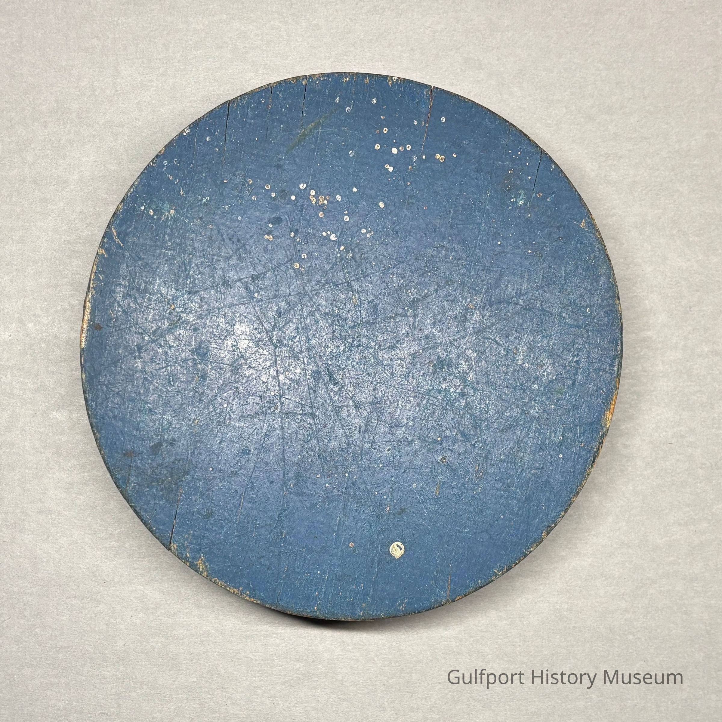 A blue wooden [shuffleboard disc from the Gulfport Shuffleboard Club].