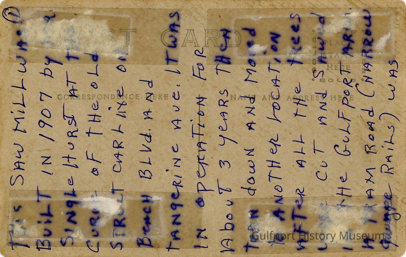 THIS SAW MILL WAS BUILT IN 1907 BY ISA (?) SINGLEHURST AT THE CORNER OF THE OLD STREET CAR LINE ON BEACH BLVD AND TANGERINE AVE. IT WAS IN OPERATION FOR ABOUT 3 YEARS THEN TORN DOWN AND MOVED TO ANOTHER LOCATION AFTER ALL THE TREES WERE CUT AND SAWED IN THE GULFPORT AREA. A TRAIN ROAD (NARROW GAUGE RAILS) WASTranscriber