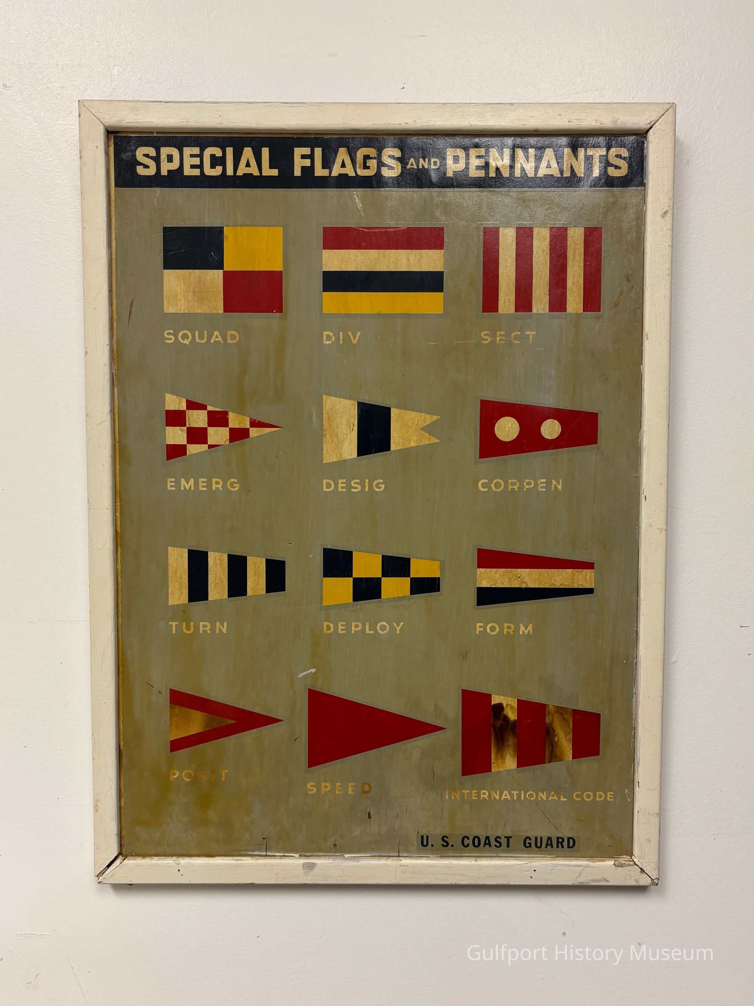 An informational framed sign titled "SPECIAL FLAGS AND PENNANTS," featuring squad, div, sect, emerg, desig, corpen, turn, deploy, form, posit, speed, and international code designs.Context