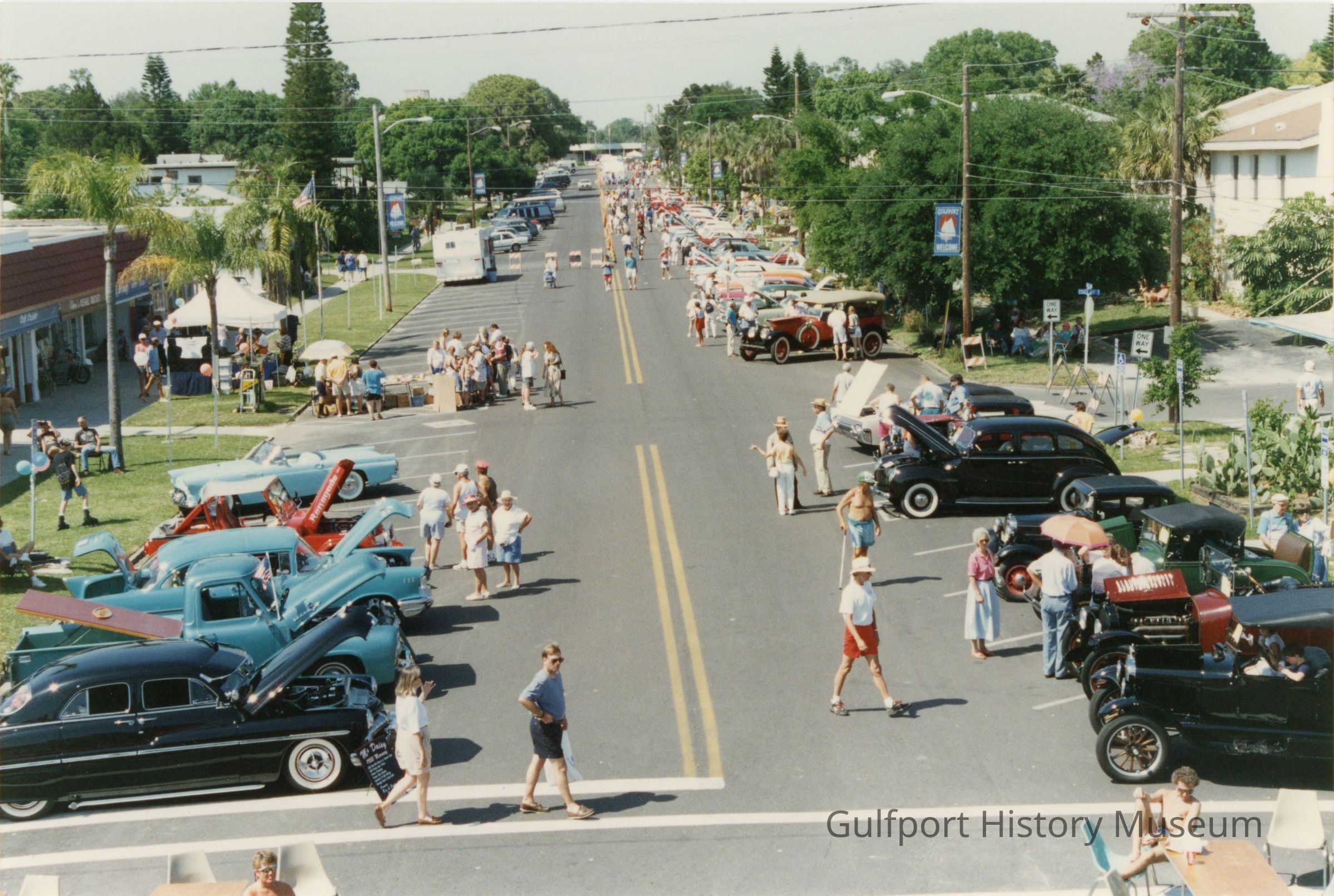 A color photograph of the Spring Festival (?) on Beach Blvd looking north at Shore Blvd. People walk in the street and there are tables and chairs set up in the intersection. Various vintage cars are parked along the road. Banners that read "GULFPORT WELCOME" hang from streetlights. The front of the Gulfport Public Library is visible at the end of the road in the background.