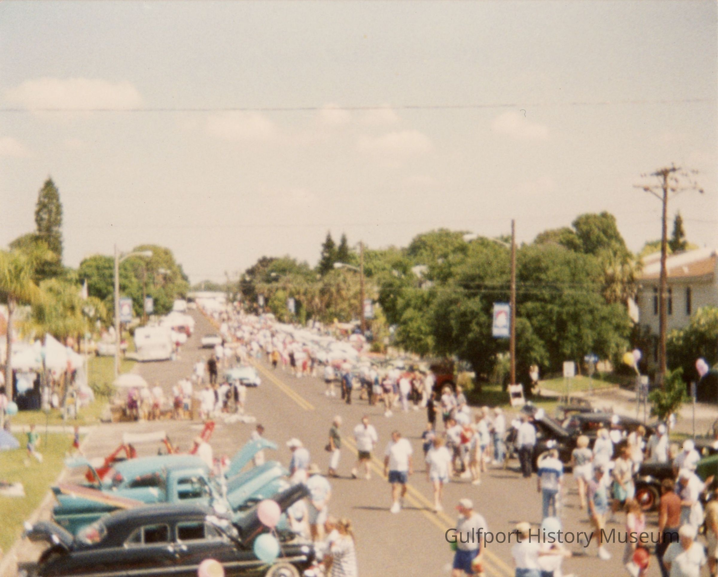 A color photograph of a car show on Beach Blvd looking north at Shore Blvd. People walk in the street. Various vintage cars are parked along the road. Banners that read "GULFPORT WELCOME" hang from streetlights. The front of the Gulfport Public Library is visible at the end of the road in the background.