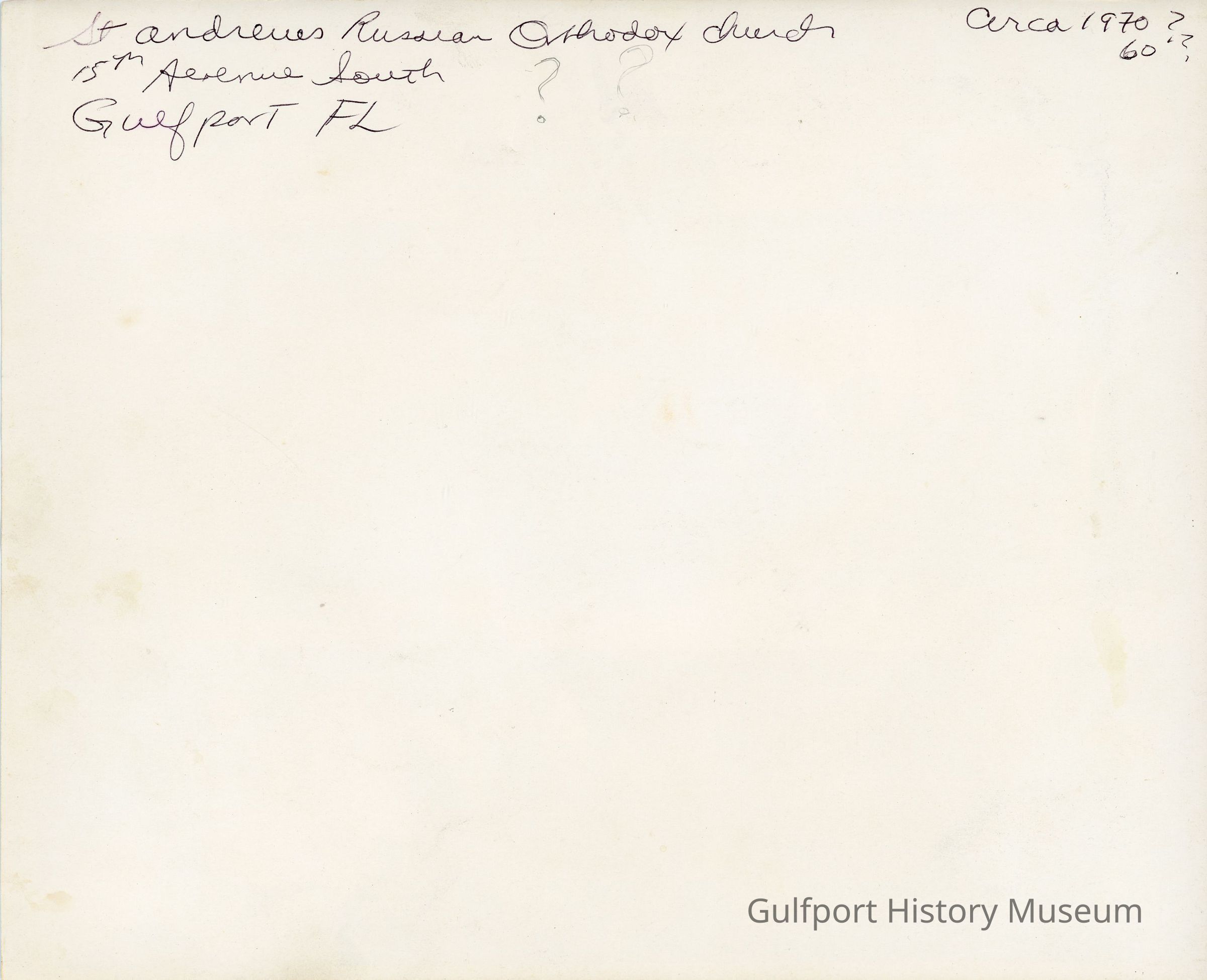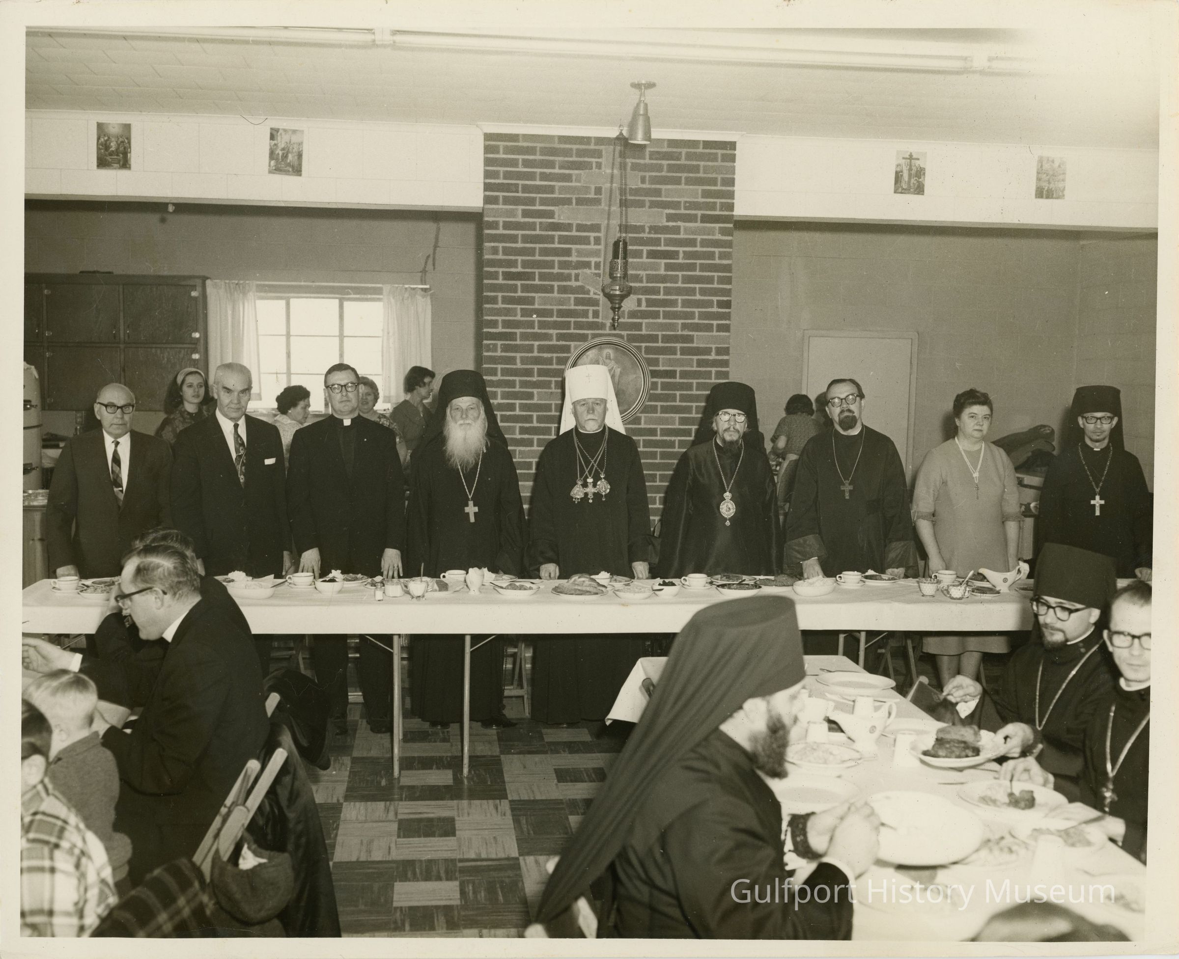 A black and white photograph of the interior of St. Andrew's Russian Orthodox Church (or meeting place) during an event. There are people standing behind a table facing the camera and people seated at tables eating. Some members of the church are wearing cassocks and klobuks.
