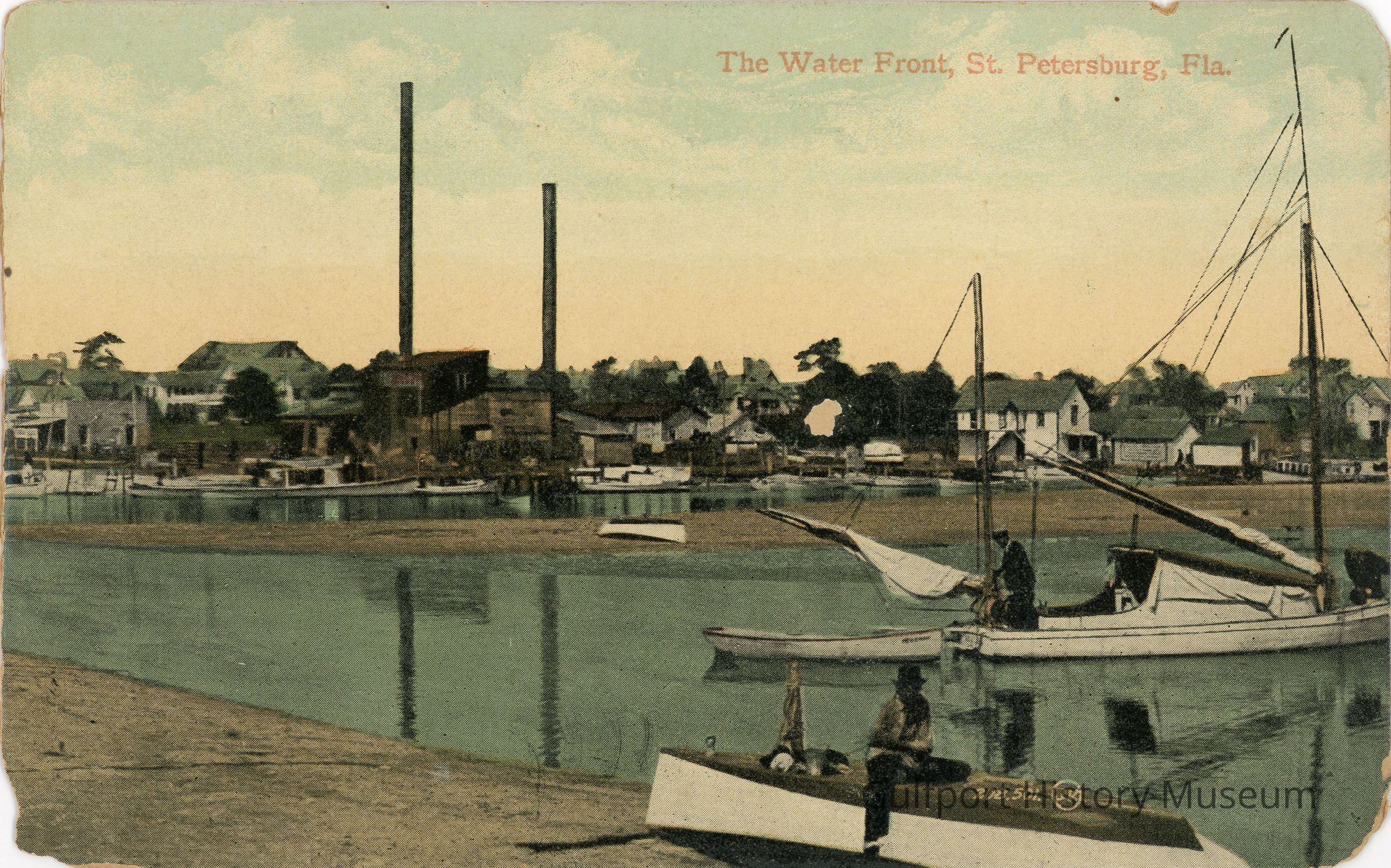 A colorized photograph postcard of the waterfront in St. Petersburg, Florida on Tampa Bay. There are several boats docked along the shore. A man sits on an upturned boat on the shore in the foreground. Two men are lowering the sails on a boat in the water. It appears to be sunrise or sunset.