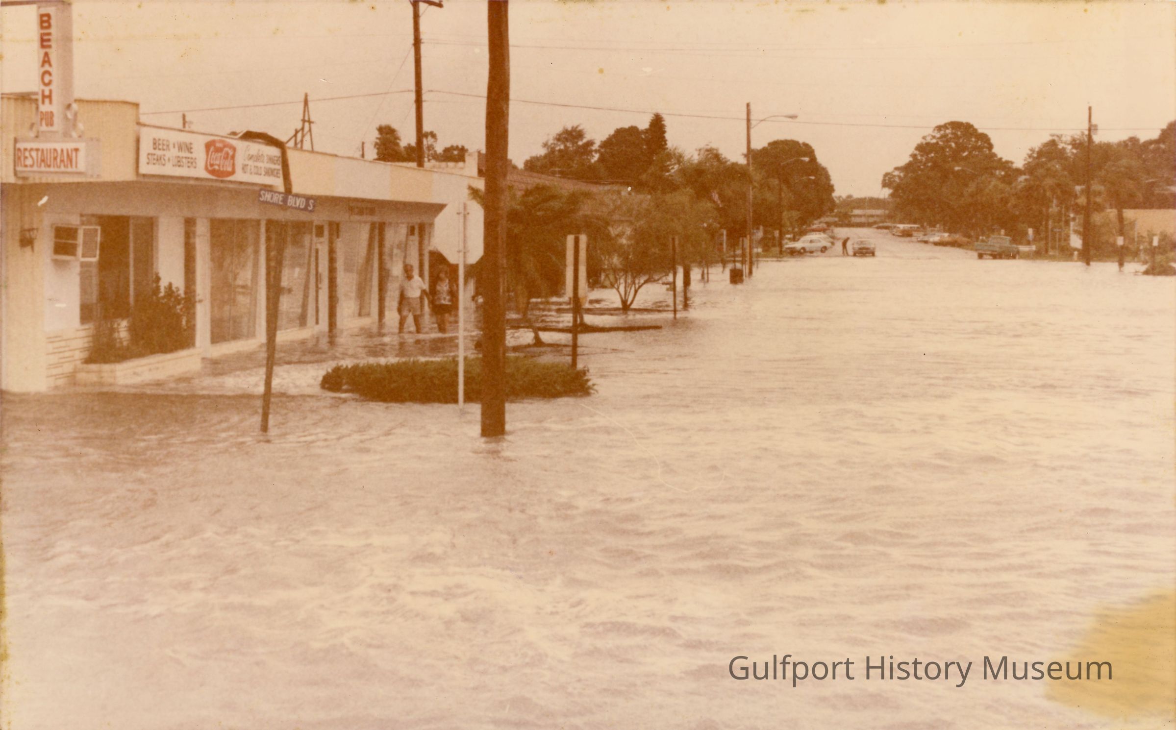 A color photograph of flooding during Subtropical Storm One looking north on Beach Blvd from the Gulfport Casino. Two people are walking through the calf deep water on the submerged sidewalk towards the camera. The road is lined with lampposts, trees, and partially submerged vehicles. The Gulfport Public Library can be seen at the end of the street in the background.