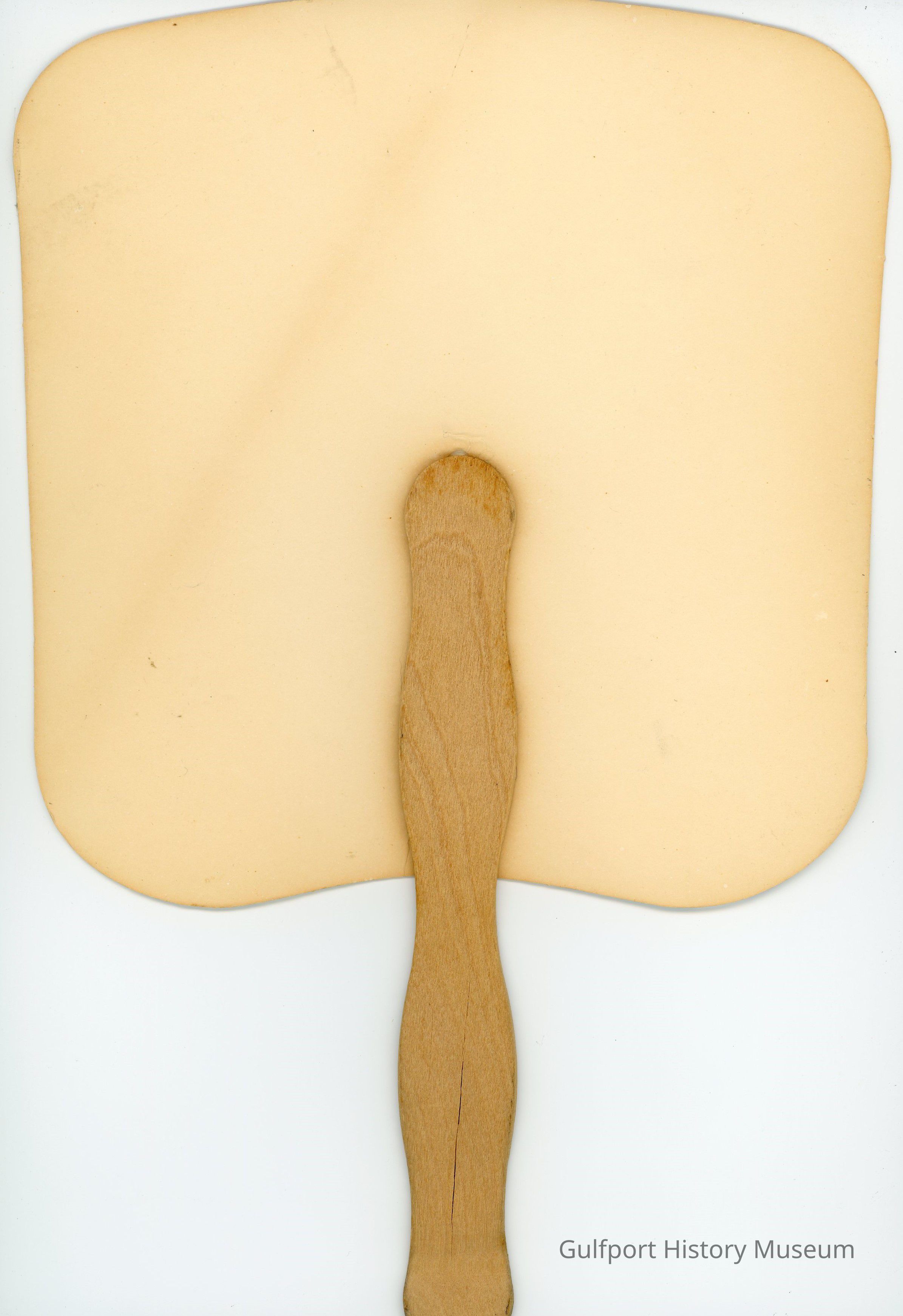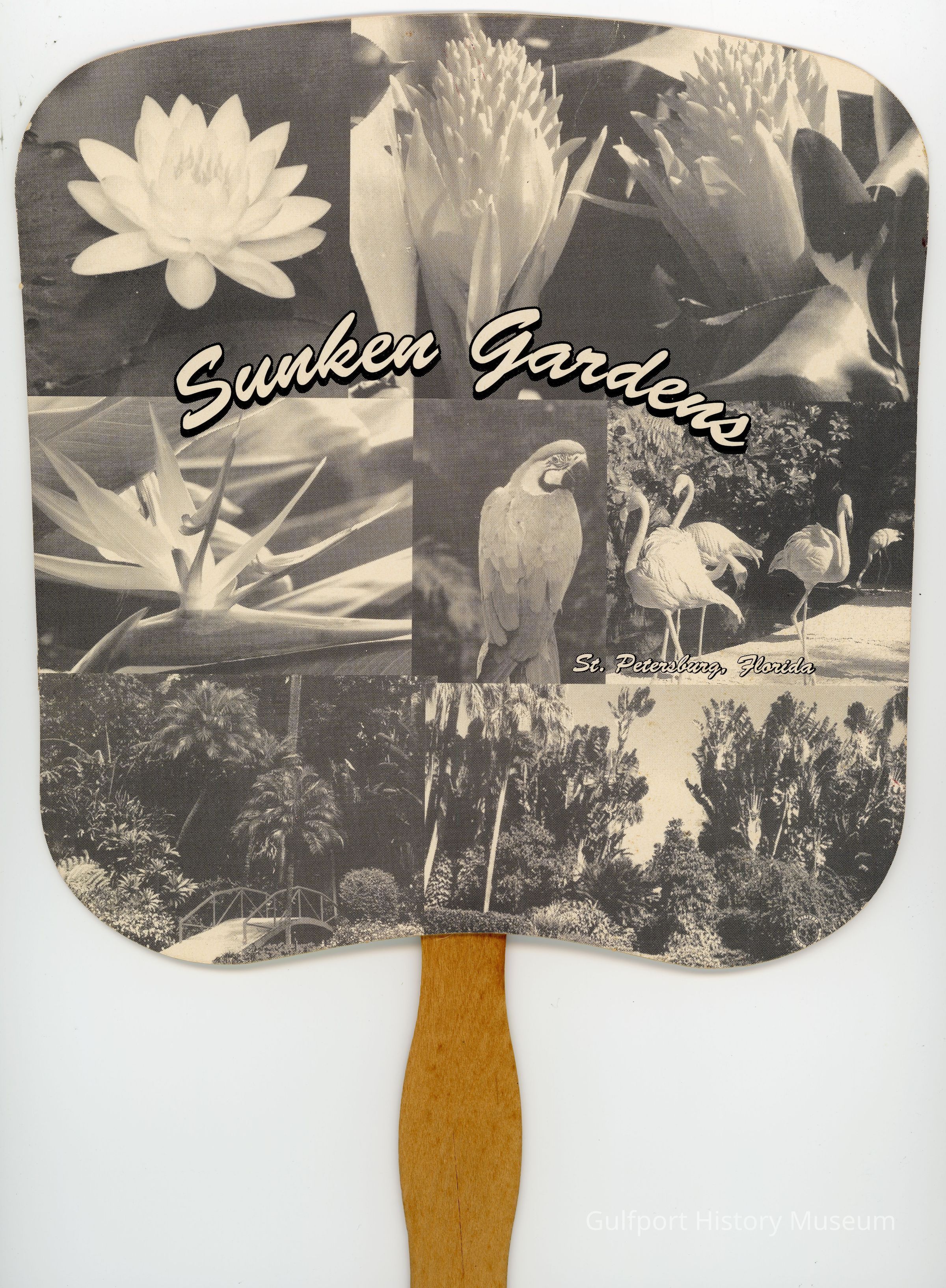 A single sided paper hand fan with a flat wooden handle. The printed side is a black and white collage with photographs of Sunken Gardens featuring plants and birds. It reads, "Sunken Gardens" and "St. Petersburg, Florida."