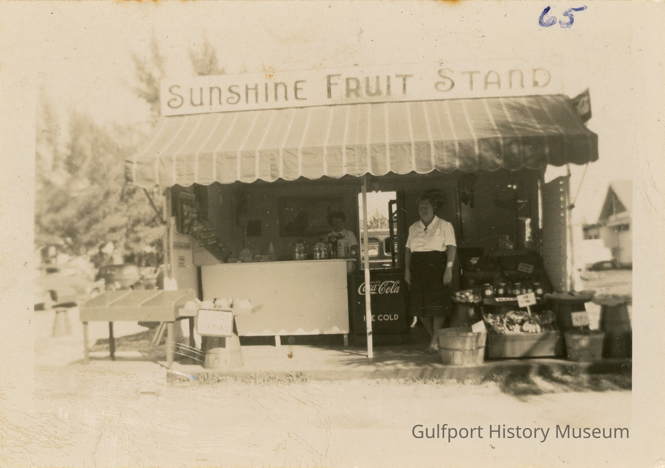 A black and white photograph of the Sunshine Fruit Stand which stood at the corner of Beach Blvd and Essex Ave S. Two women stand under the structure.