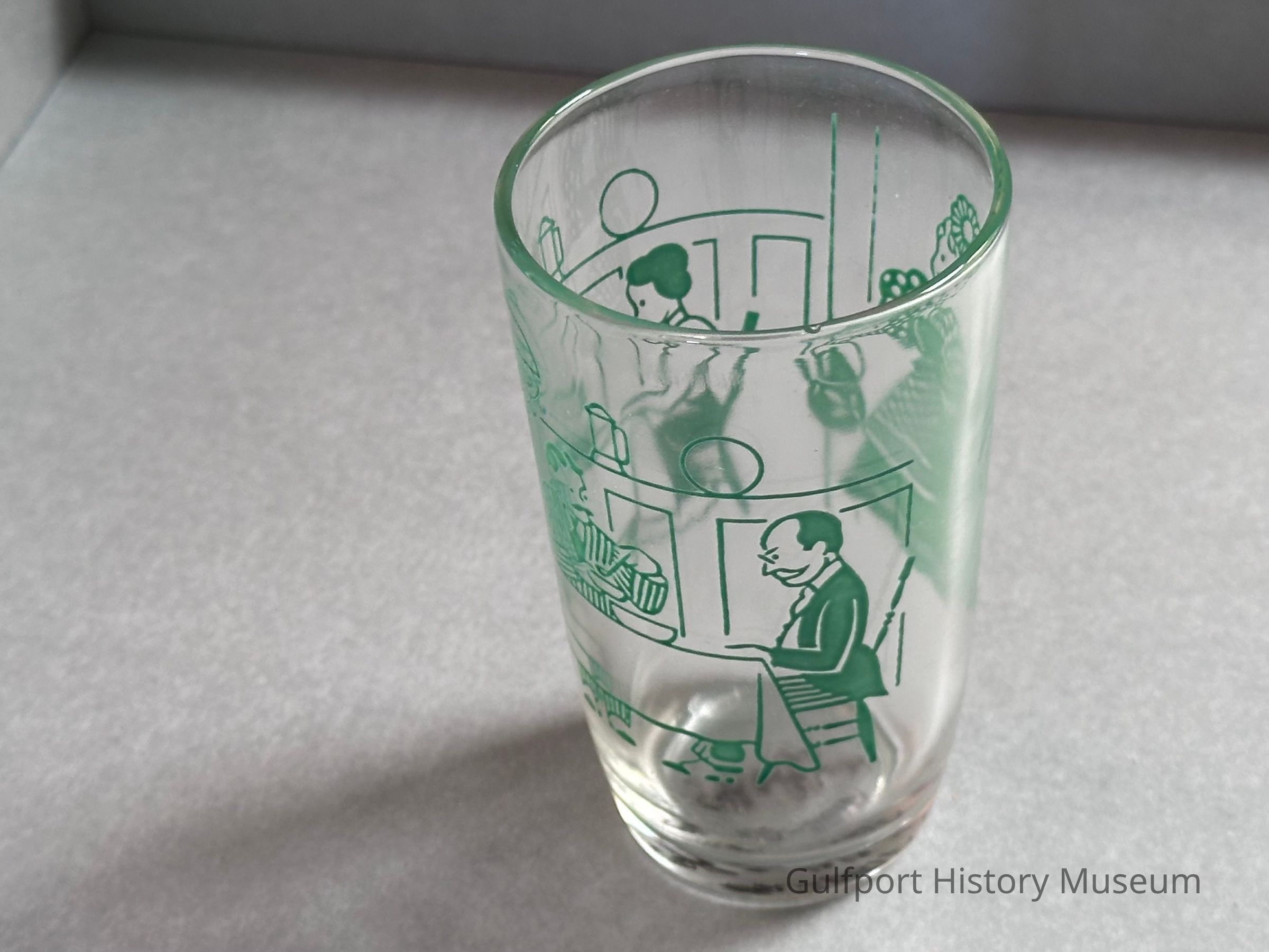 A small glass, with a green design along the outside depicting a stylized family eating a meal together.