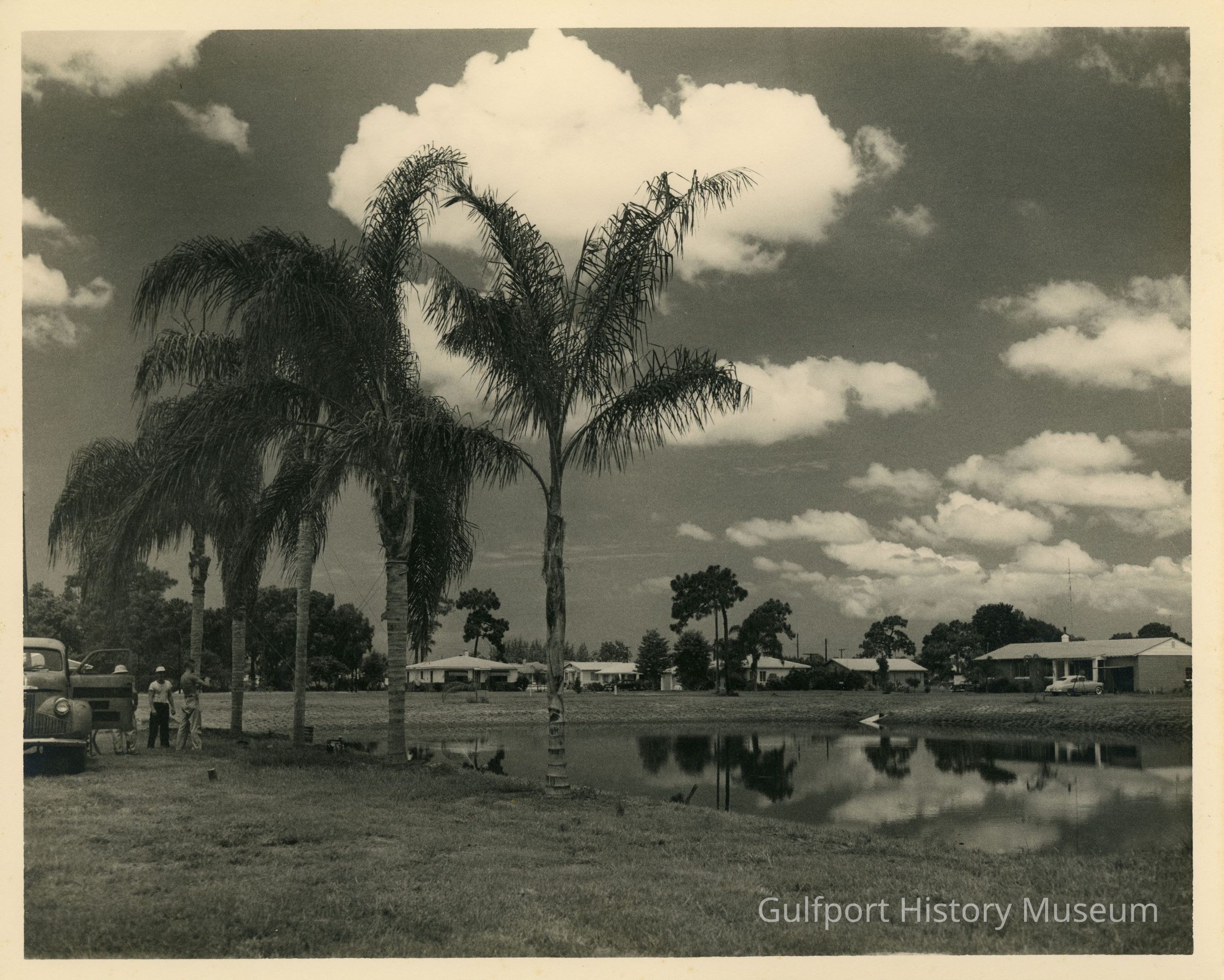 A black and white photograph of a retention pond at Tangerine Ave and [54th St and 55th St].