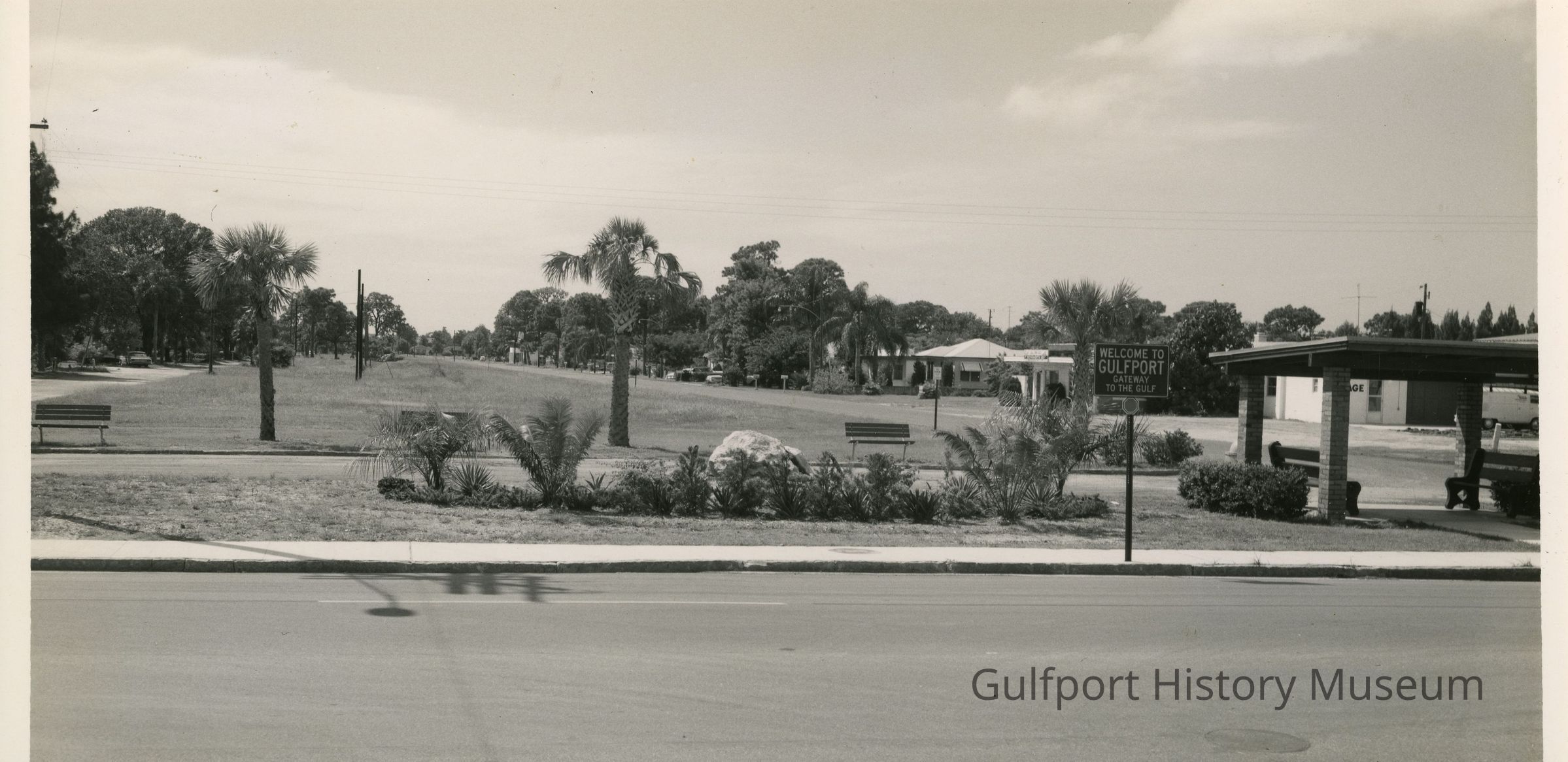 A black and white photograph of the Tangerine Avenue Greenway from 49th St S. A sign that reads "WELCOME TO GULFPORT GATEWAY TO THE GULF" and a shelter stand by the road.