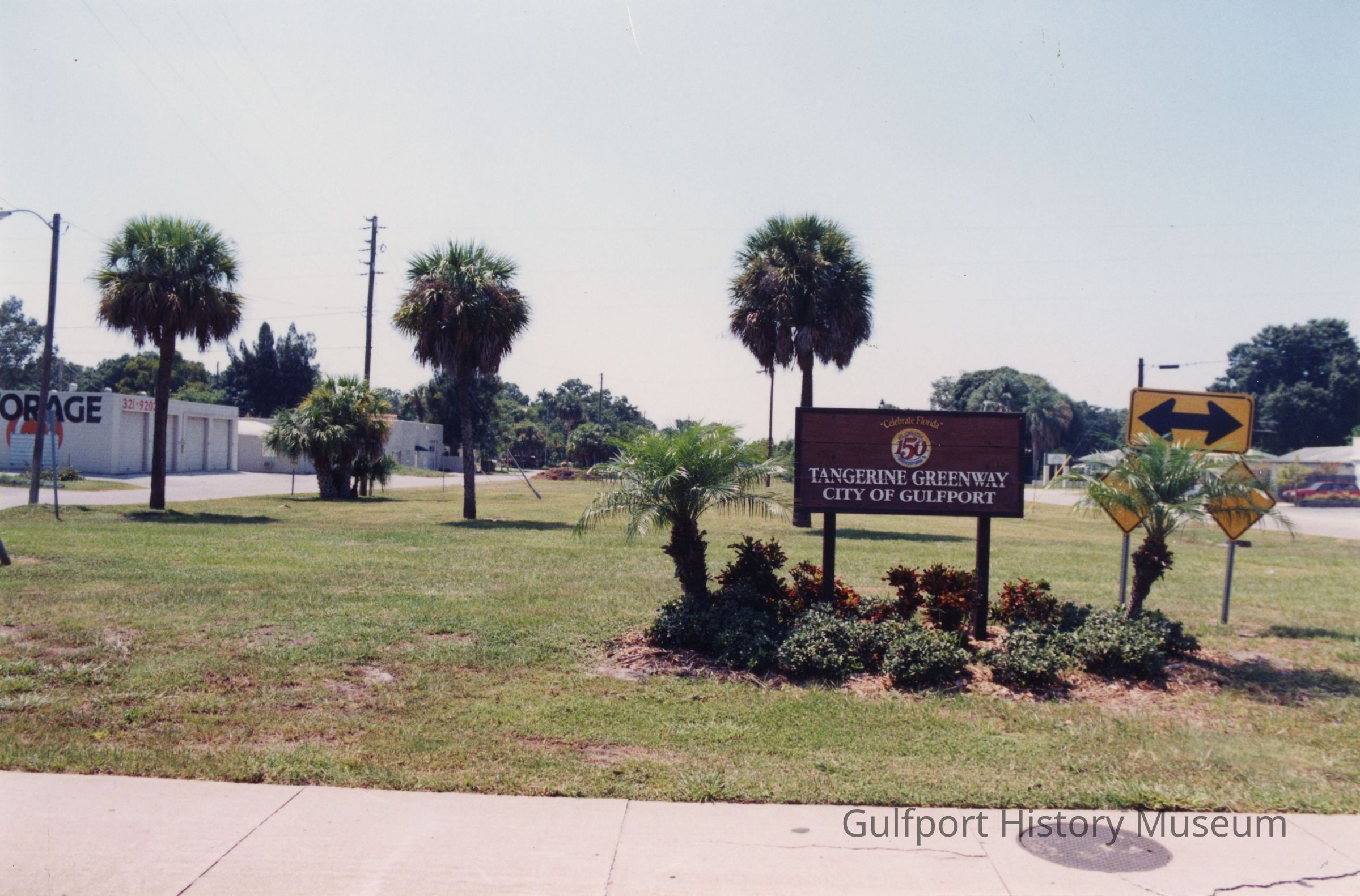 A color photograph of a wooden sign, circa 1974, on the Tangerine Greenway at 49th St S which reads:
