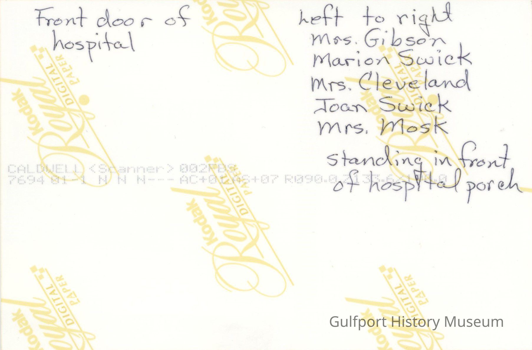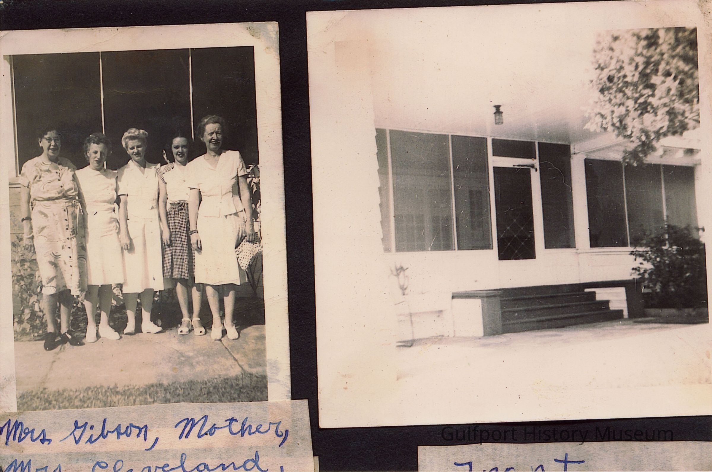A black and white photographic print of a scrapbook page. It shows two photographs, the one on the left is of five women standing on the sidewalk outside of a building, and the one on the right shows the front door of a hospital. There are labels below each photograph, with only the left label being partially visible. It reads: "Mrs Gibson, Mother, Mrs Cleveland,".