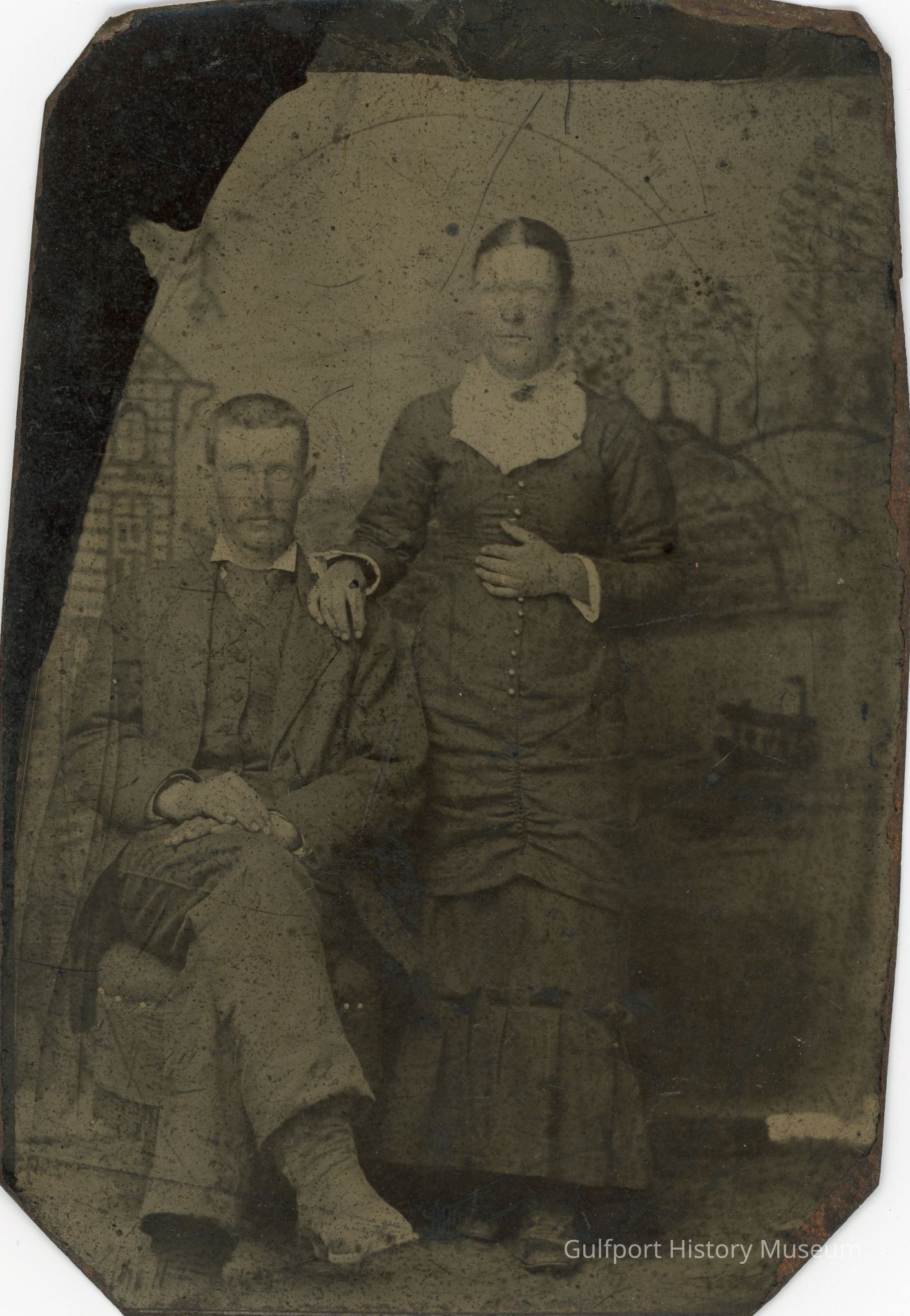 A tintype portrait of a man and a woman. The man sits in a chair and the woman stands next to him.