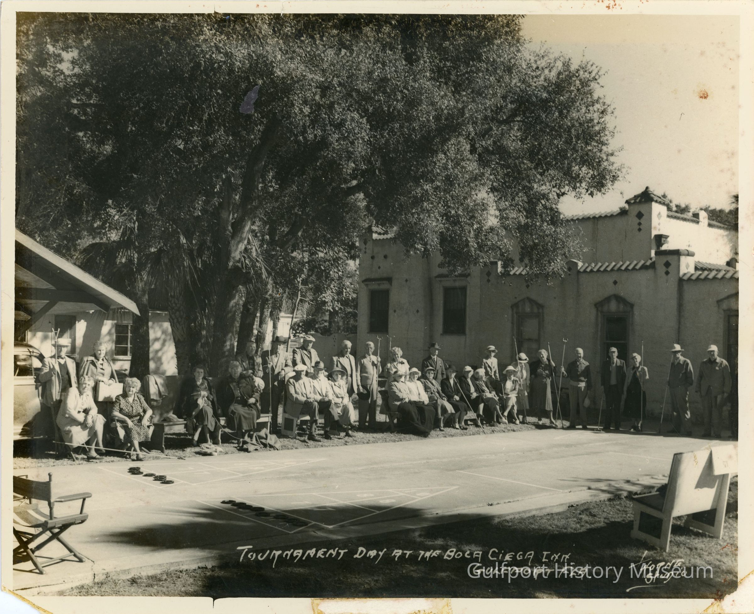 A black and white photograph of a shuffleboard tournament held at the Boca Ciega Inn. Shuffleboard players are lined up along the side of the court, sitting and standing. Some participants are holding their cues. There are pucks on the board in line. A tree is beside the court.