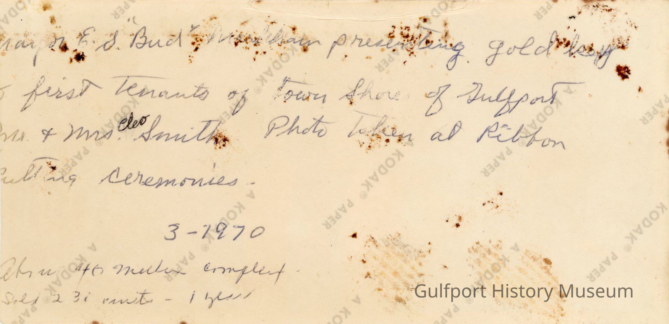 Mayor E.S. "Bud" Markham presenting gold keys to first tenants of Town Shores of Gulfport