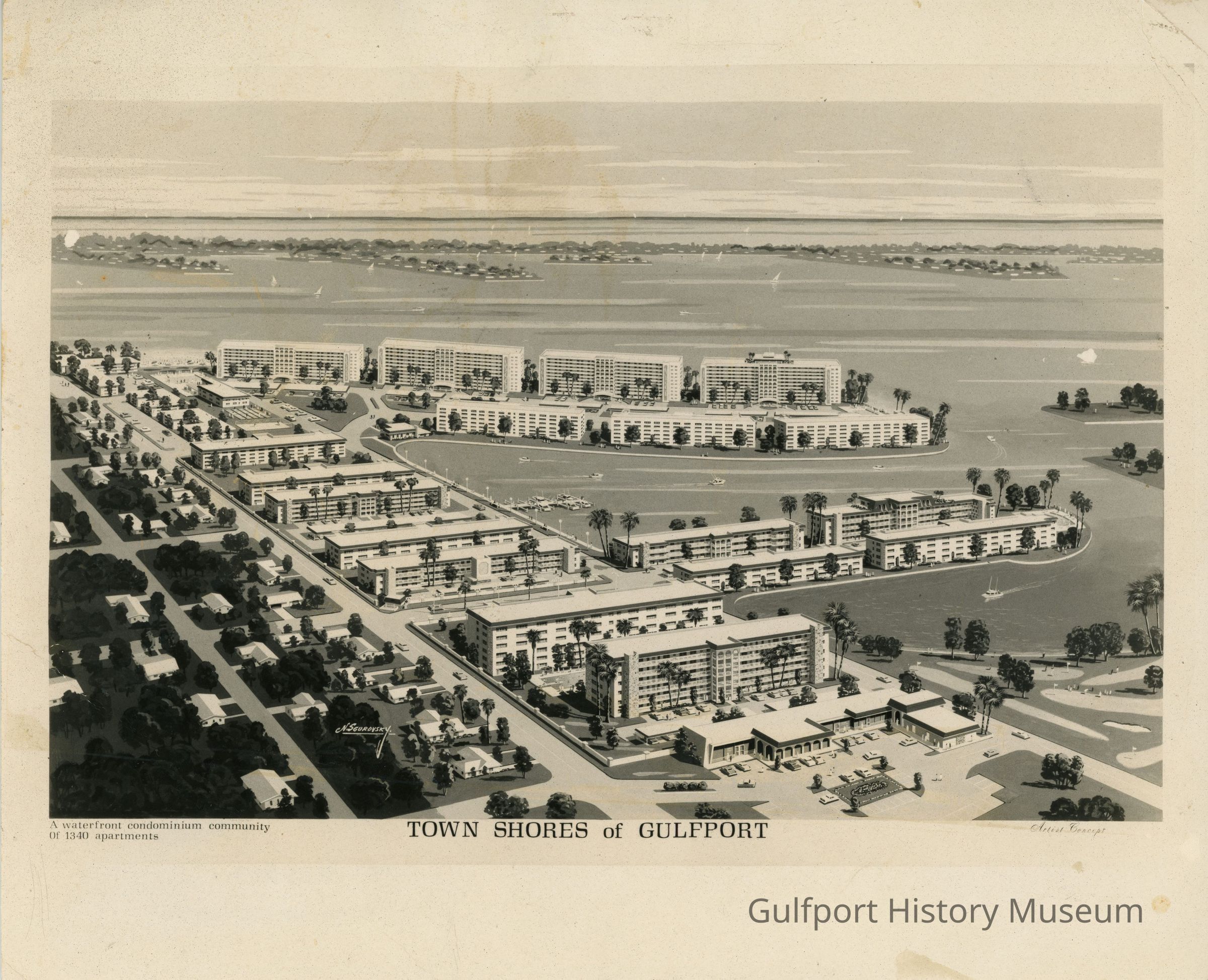 A black and white photograph of a conceptual drawing of Town Shores of Gulfport. "A waterfront community of 1340 apartments."