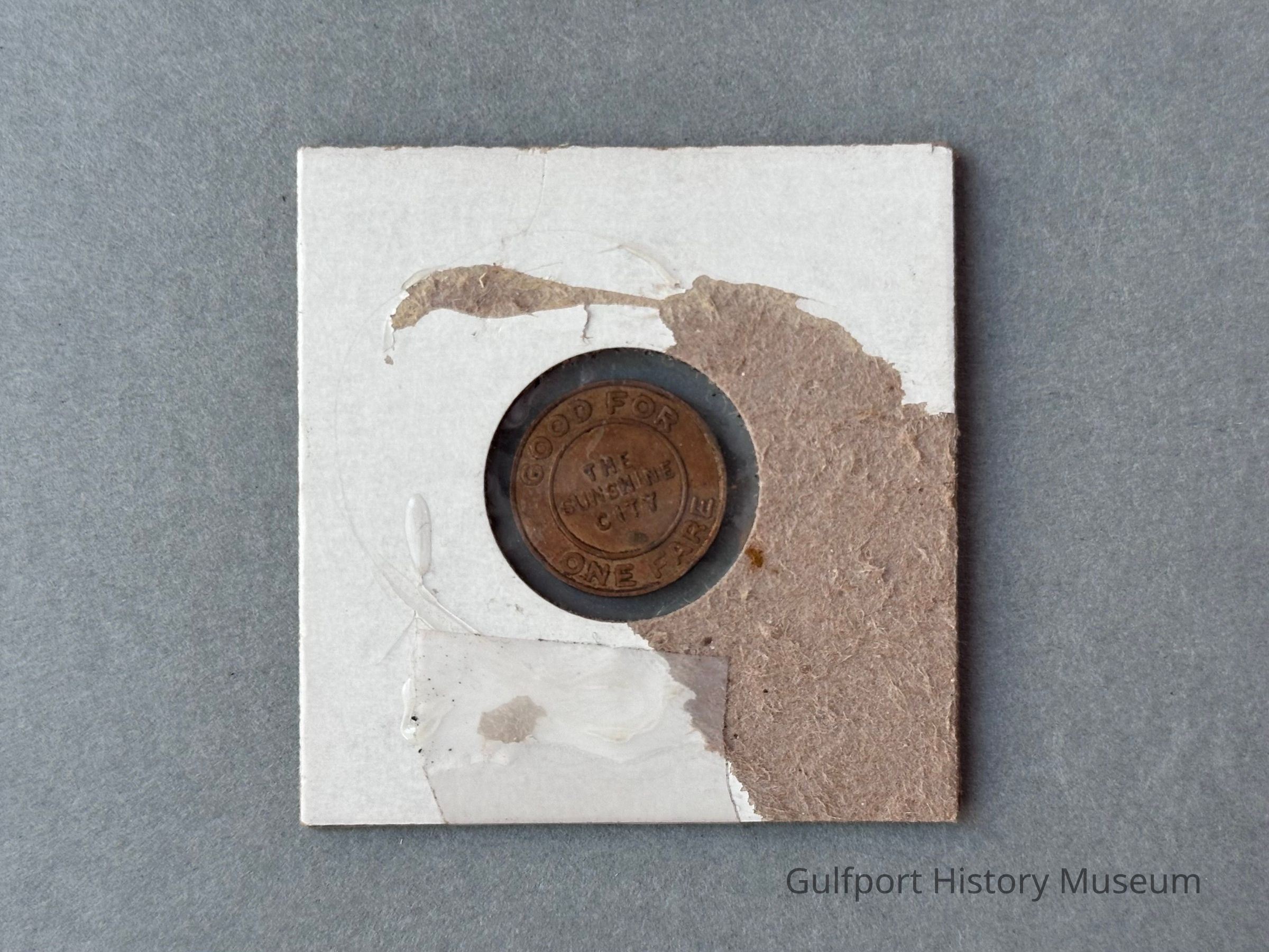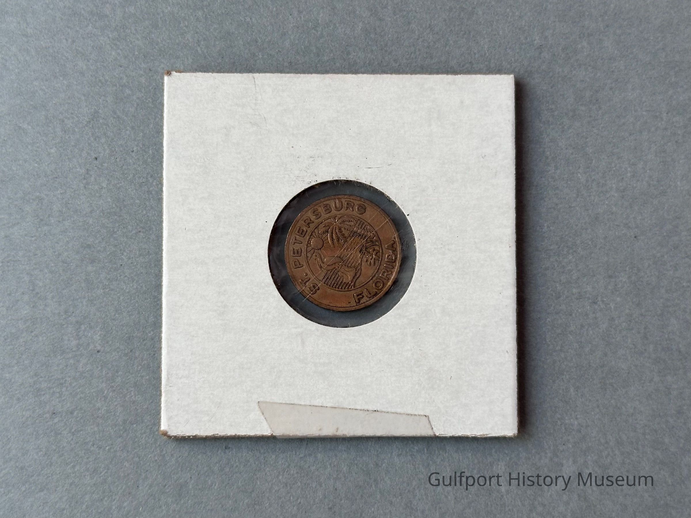 A small, copper token issued by the City of St. Petersburg, good for one [bus or trolley] fare.