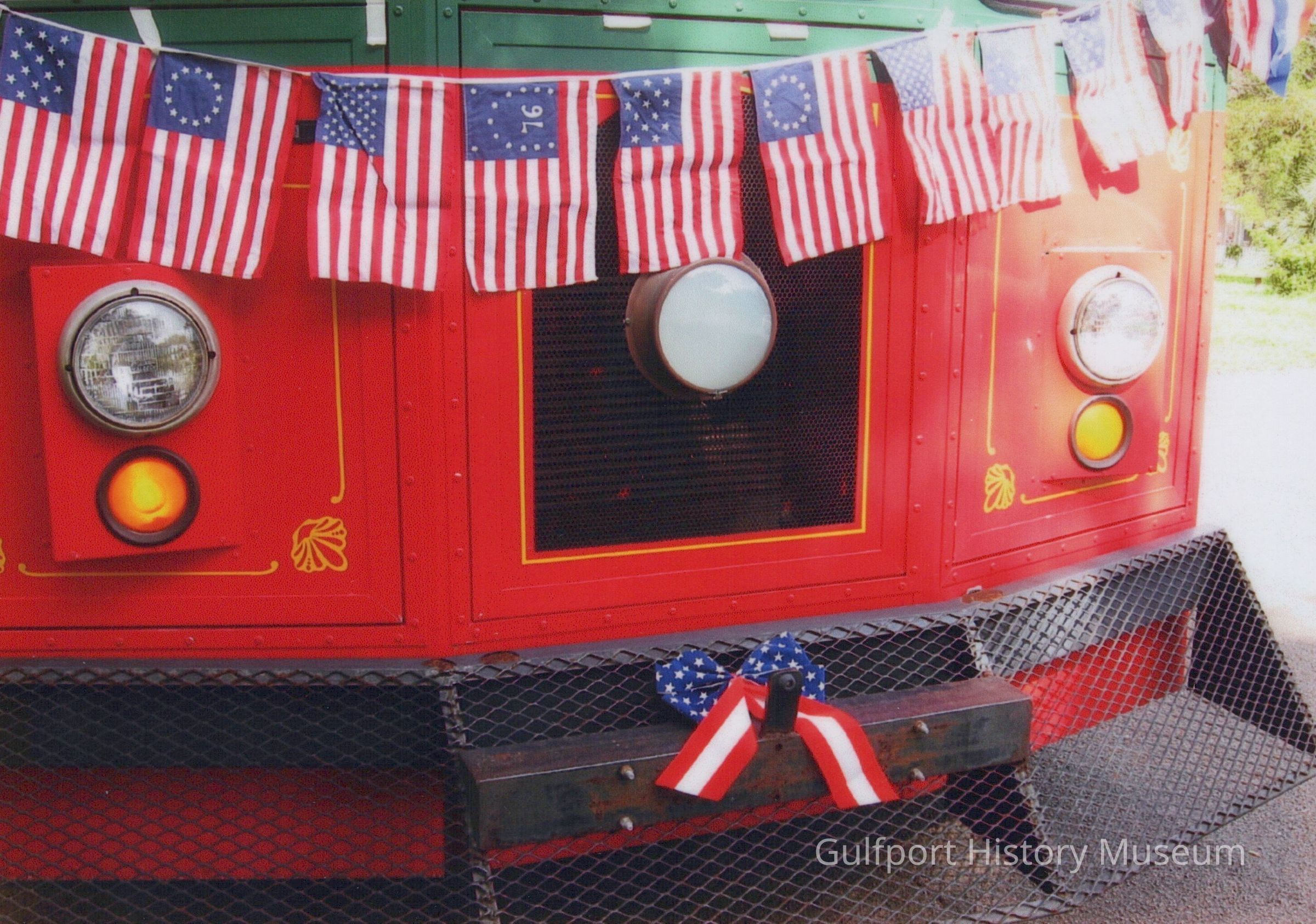 A color photograph of a [retired] trolley decorated with American flags.