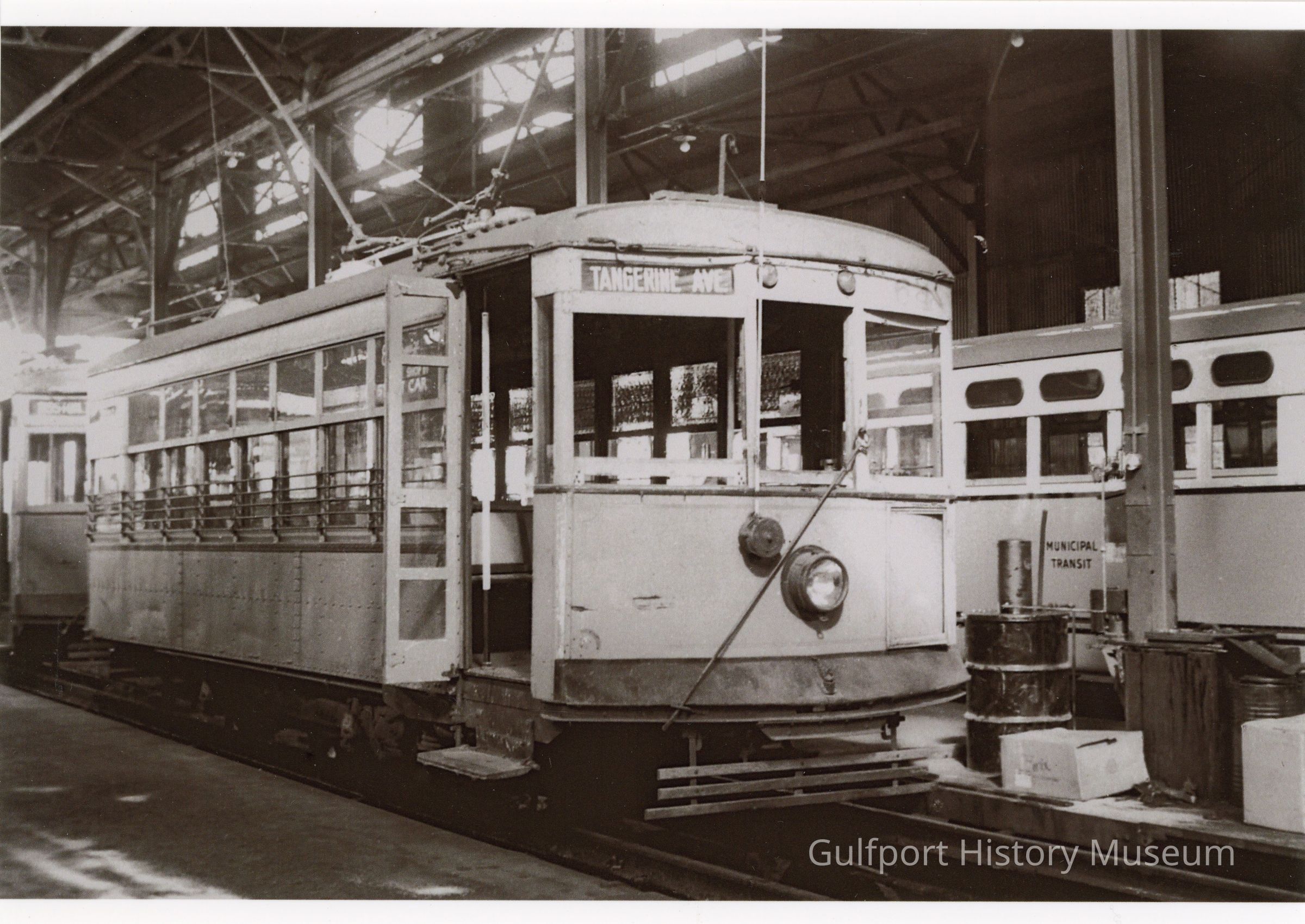 A black and white photograph of St. Petersburg to Gulfport trolley at a depot. The destination sign reads "TANGERINE AVE."