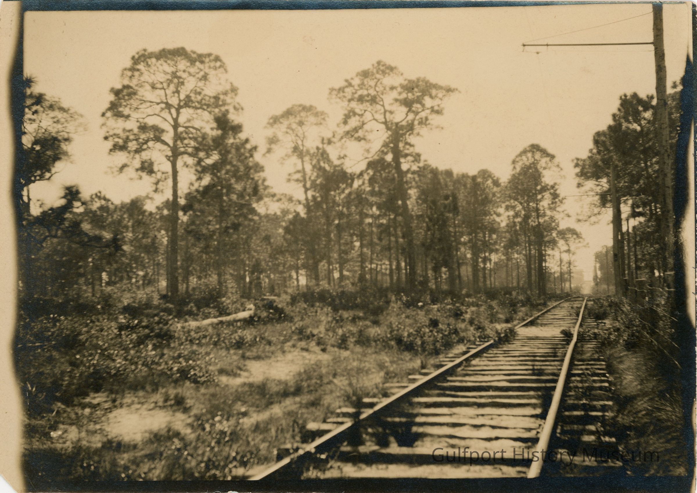 A black and white photograph of the St. Petersburg to Veteran City (Gulfport) trolley tracks.
