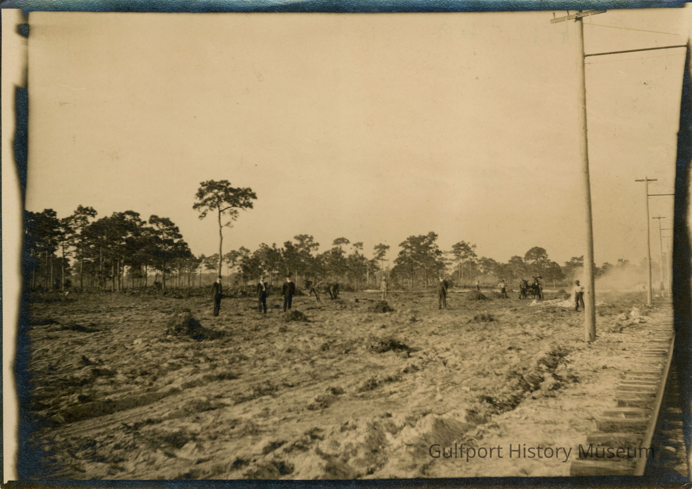 A black and white photograph of land being cleared of trees along the St. Petersburg to Veteran City (Gulfport) trolley tracks.