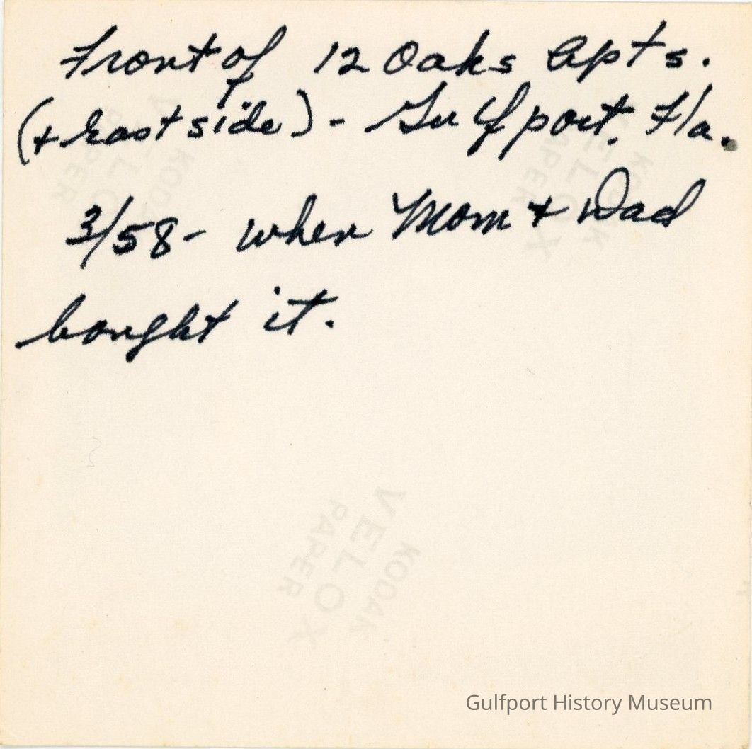 Front of 12 Oaks Apts. (+ east side) - Gulfport, Fla. 3/58 - when Mom + Dad bought it.