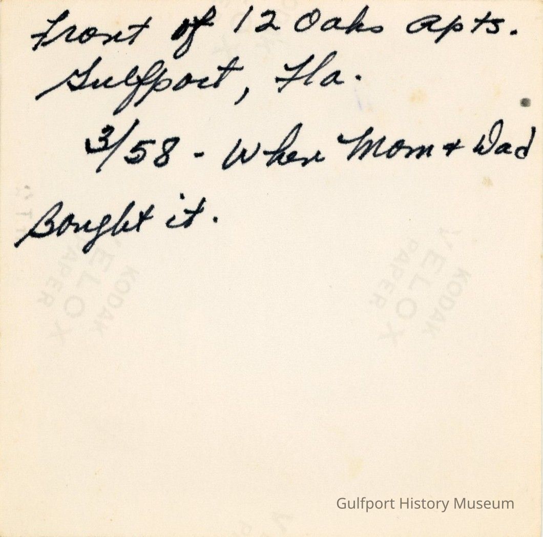 Front of 12 Oaks Apts. Gulfport, Fla. 3/58 - when Mom + Dad bought it.