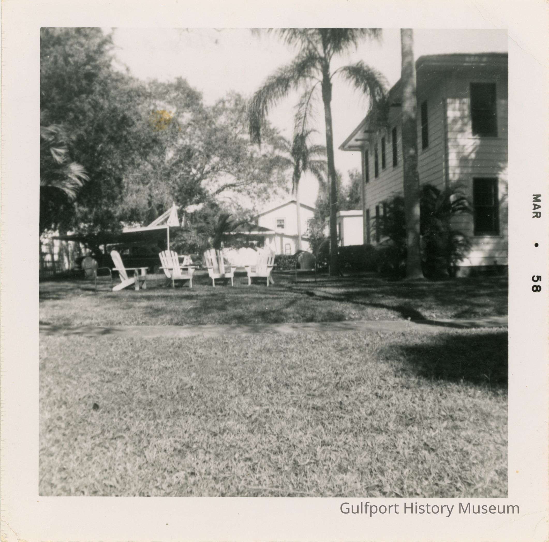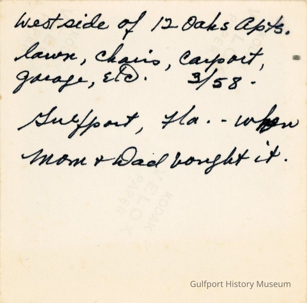 West side of 12 Oaks Apts. lawn, chairs, carport, garage, etc. 3/58 - Gulfport, Fla. - when Mom + Dad bought it.