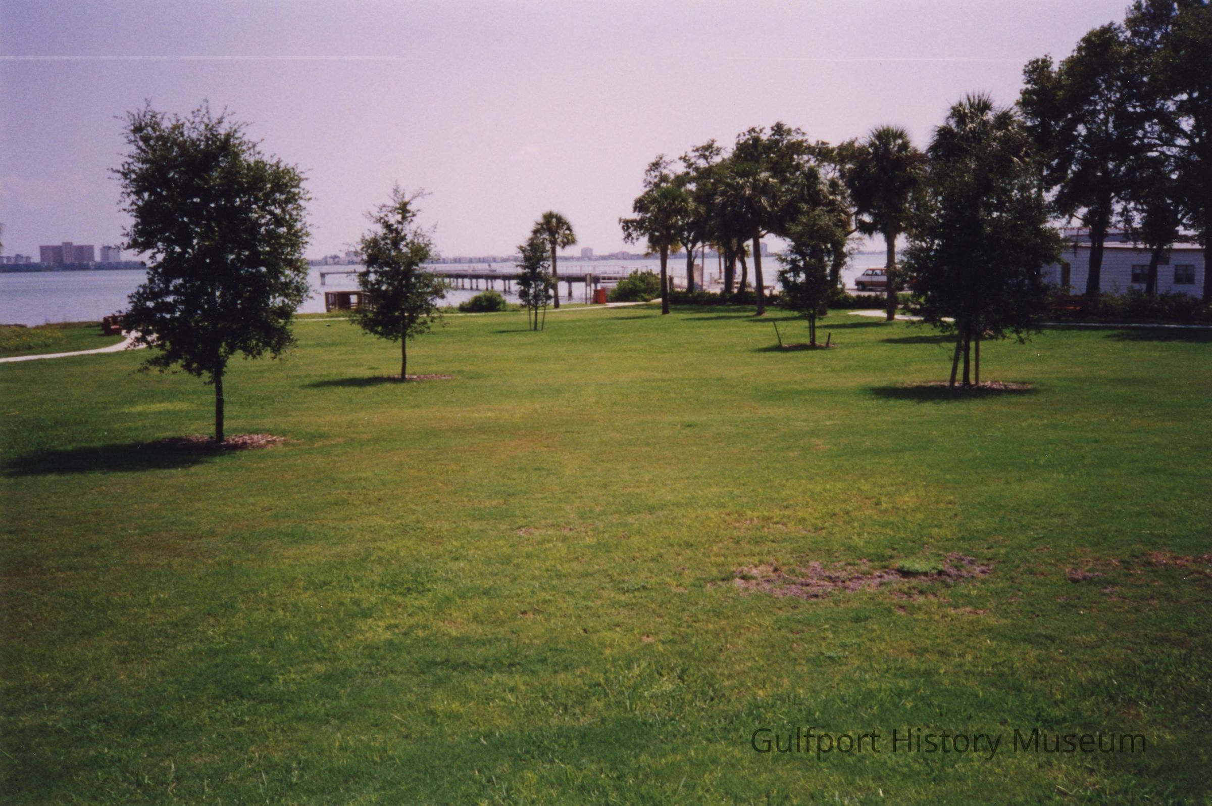 A color photograph of Veterans Park. The Gulfport Pier on Boca Ciega Bay can be seen in the background.