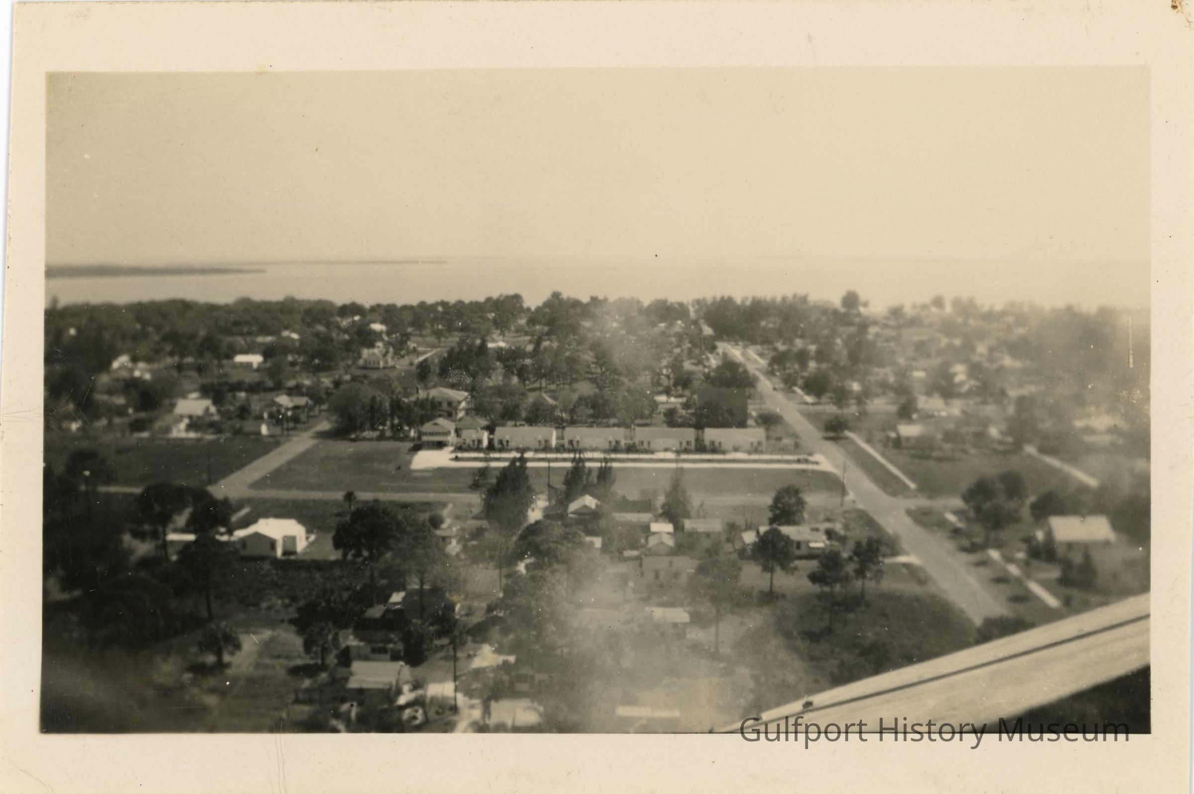 A black and white photograph from the water tower near Gulfport City Hall looking south. Boca Ciega Bay stretches out in the distance.