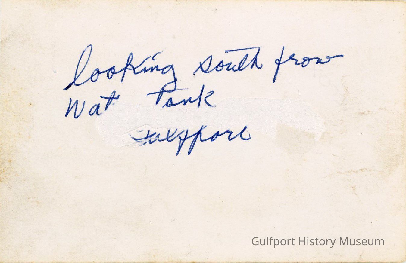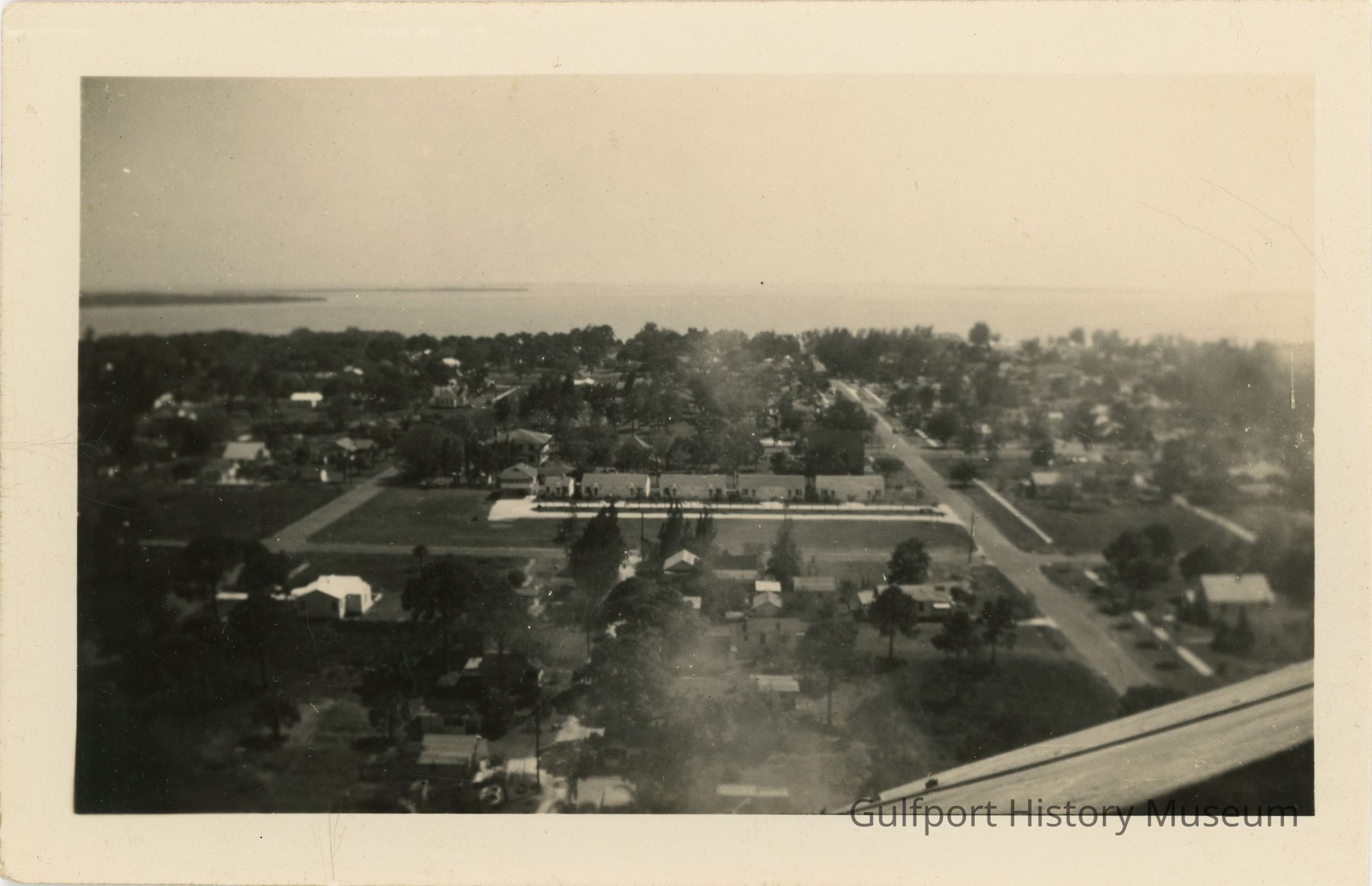 A black and white photograph from the water tower near Gulfport City Hall looking south. Boca Ciega Bay stretches out in the distance.