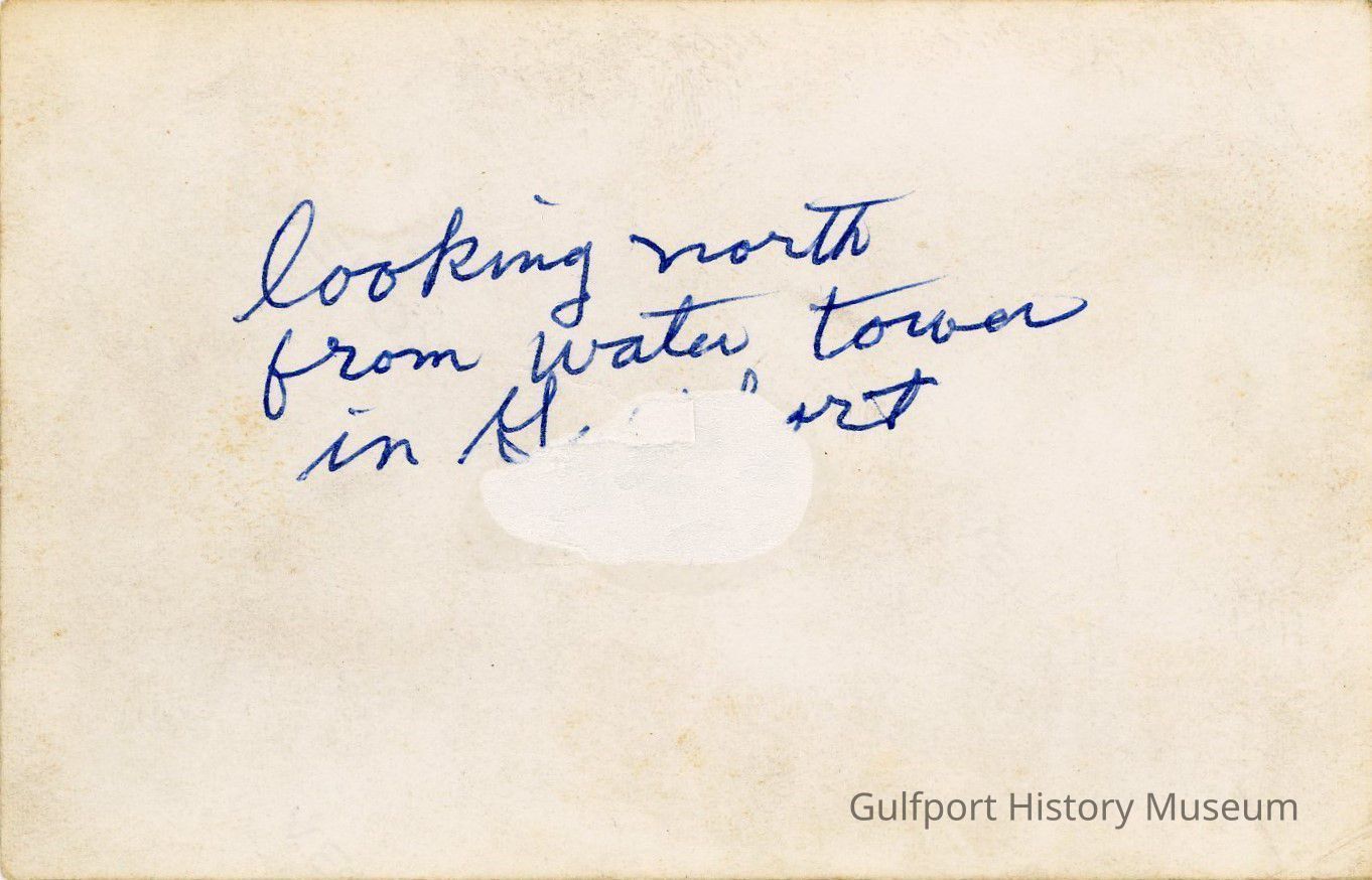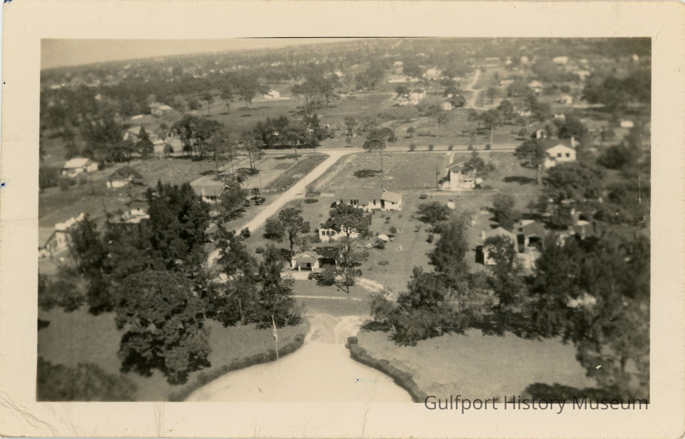 A black and white photograph from the water tower near Gulfport City Hall looking north. The round driveway entrance of City Hall is visible at the bottom of the frame.