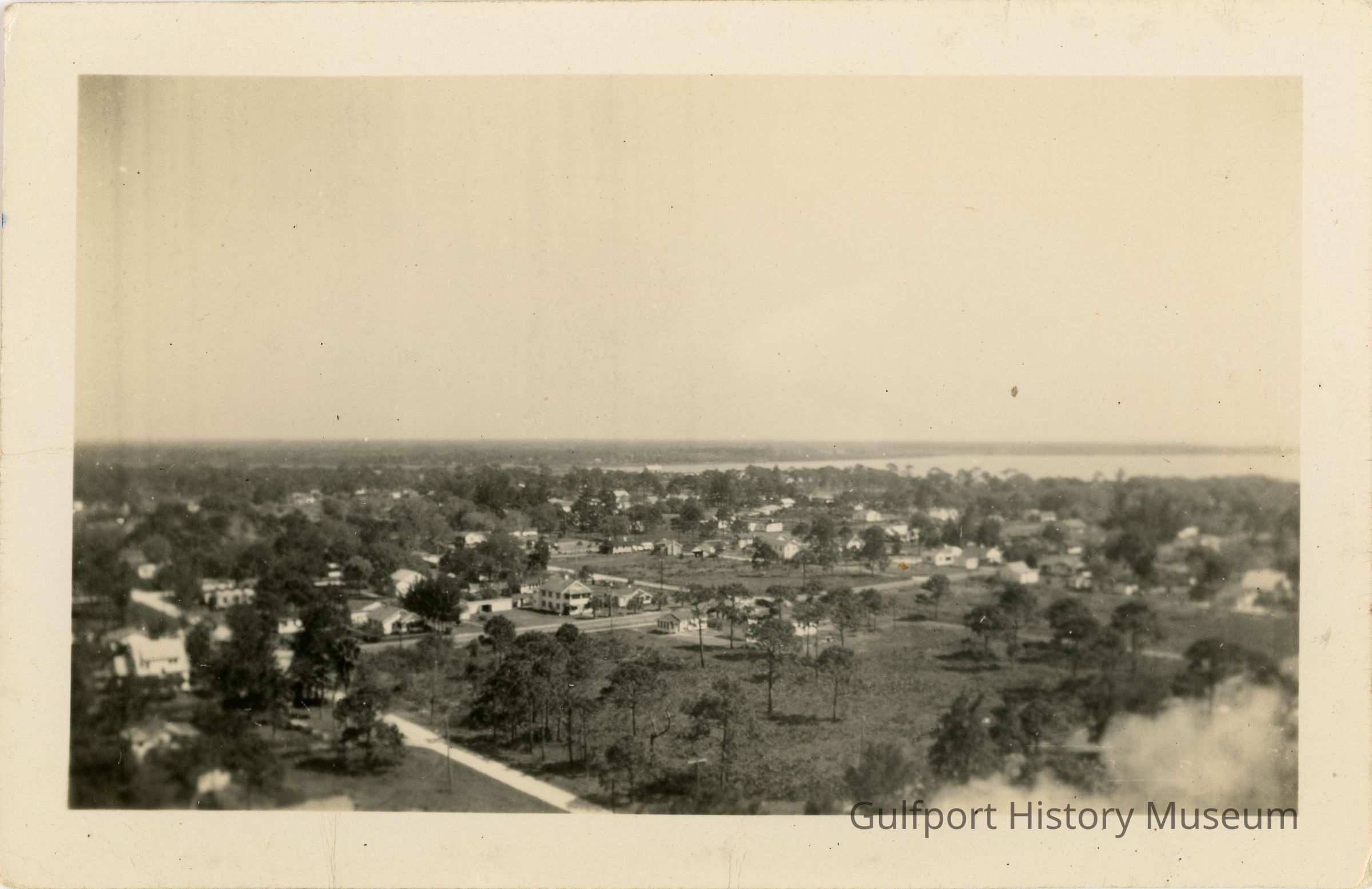 A black and white photograph from the old water tower near Gulfport City Hall. The waters of Boca Ciega Bay are visible in the distance.