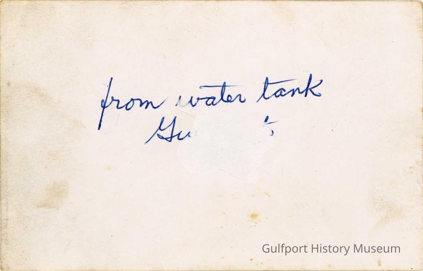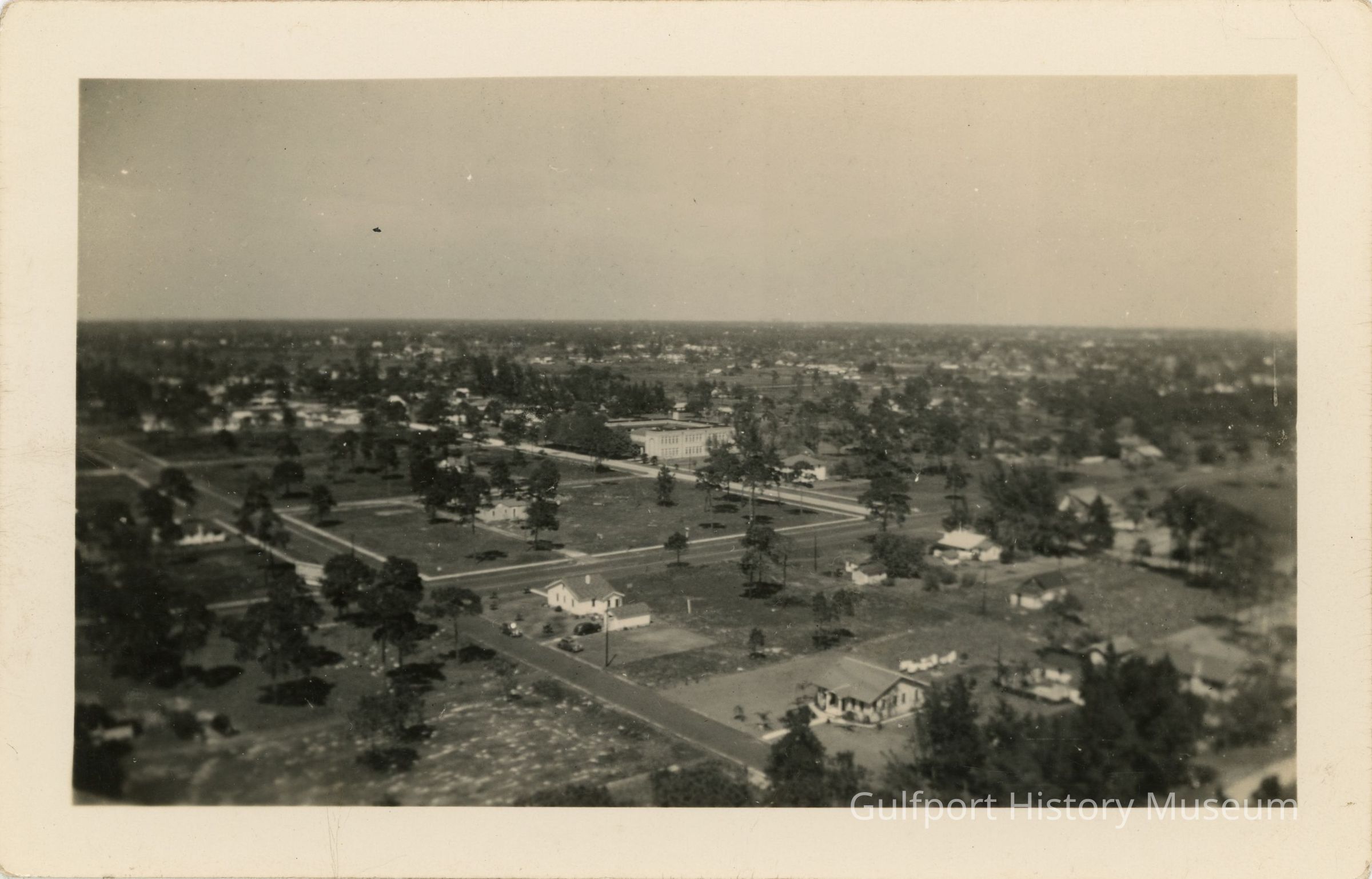 A black and white photograph from the water tower near Gulfport City Hall. The Gulfport Elementary School building is visible in the distance in the center of the frame.