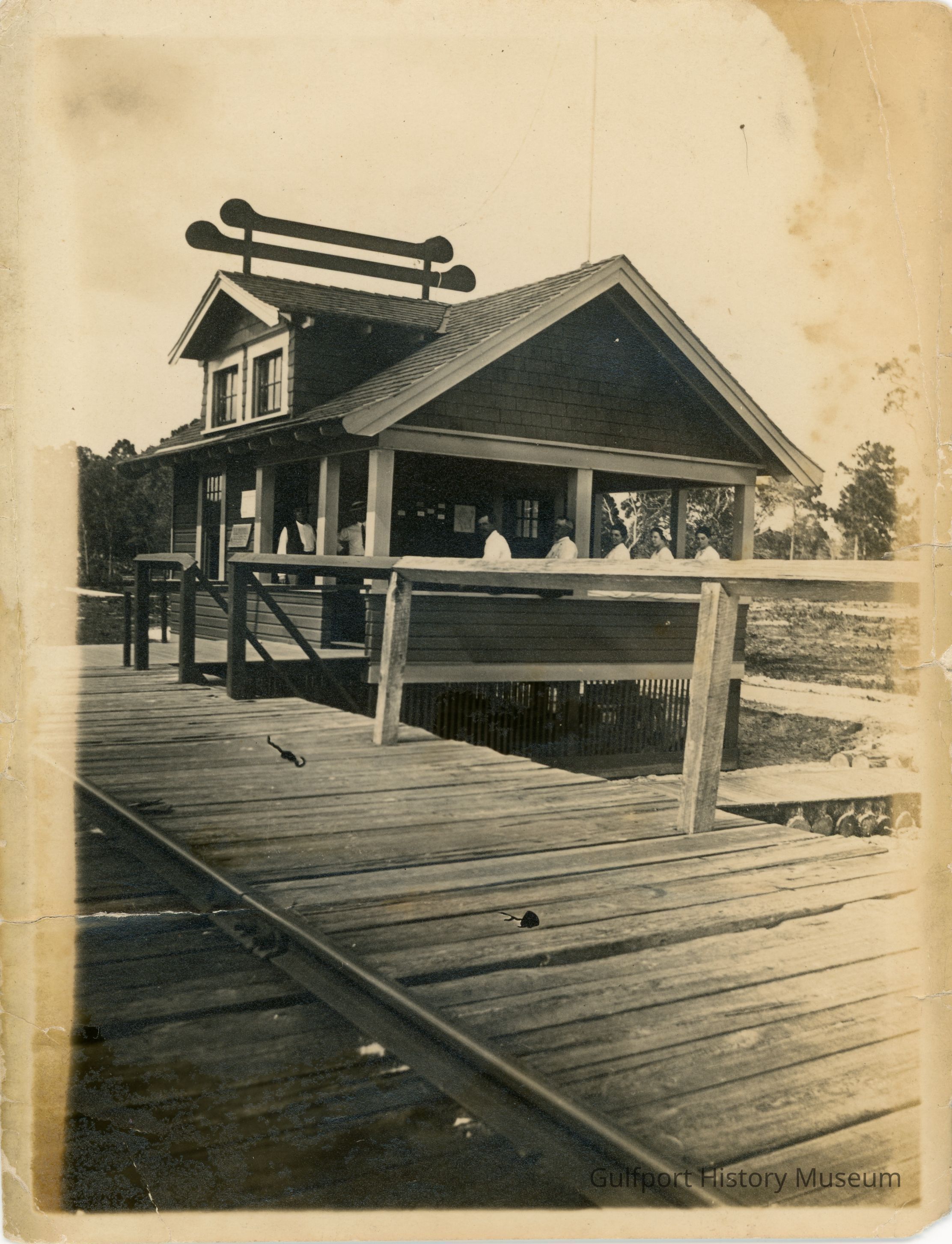 A black and white photograph of a [trolley waiting station] by the first Gulfport Casino pier. A group of people are under the roof overhang: two men stand, and two men and three women sit.