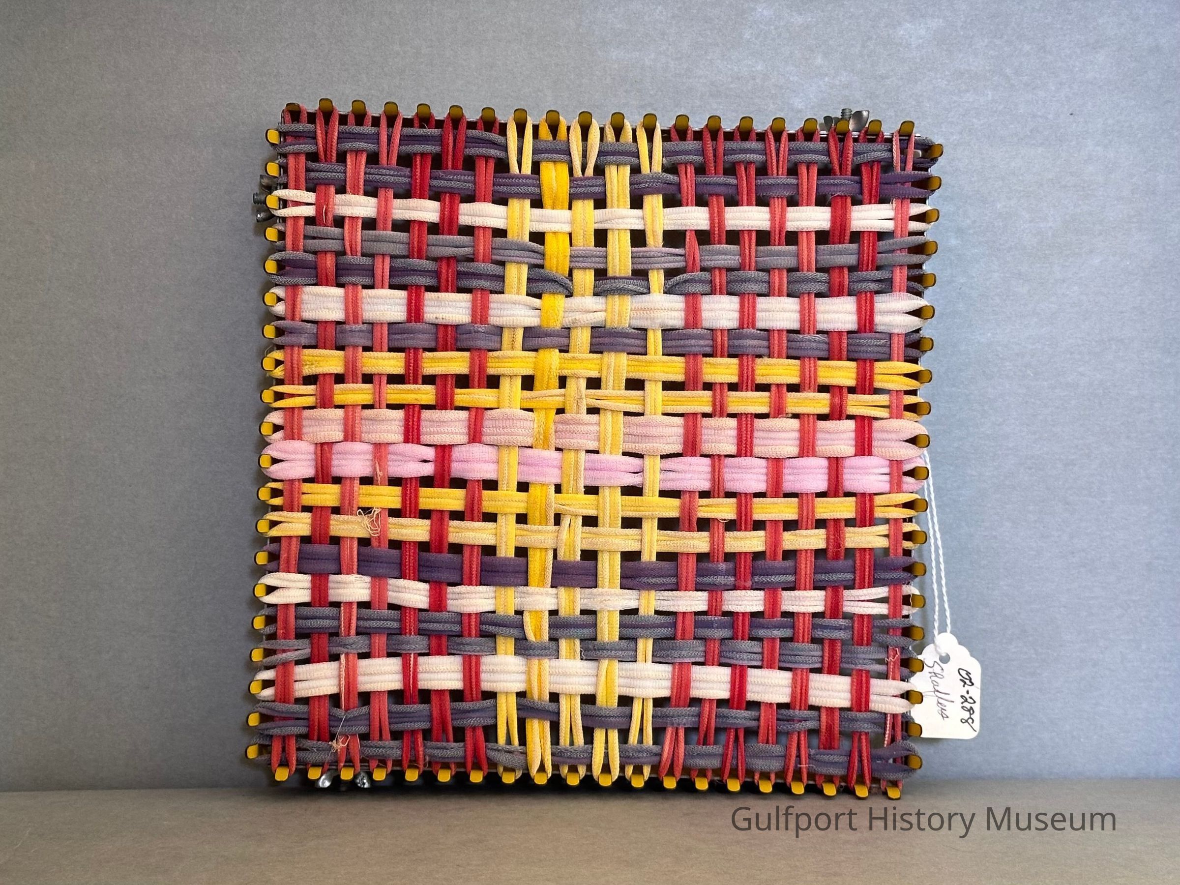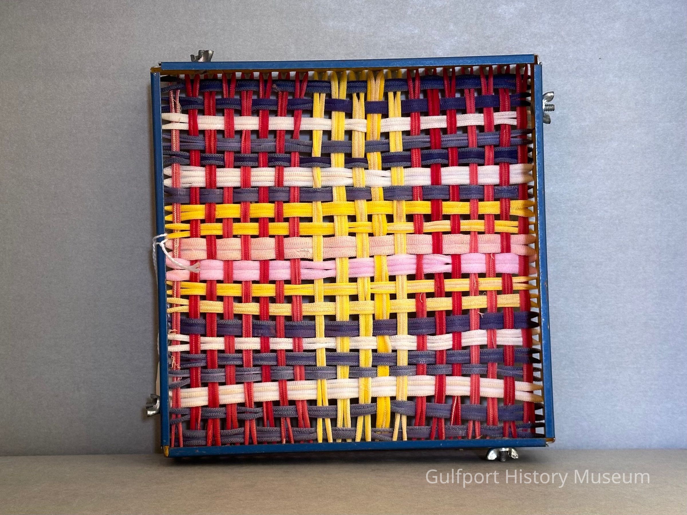 A blue and yellow, square, metal weaving loom with completed weaving of variously colored elastic bands.