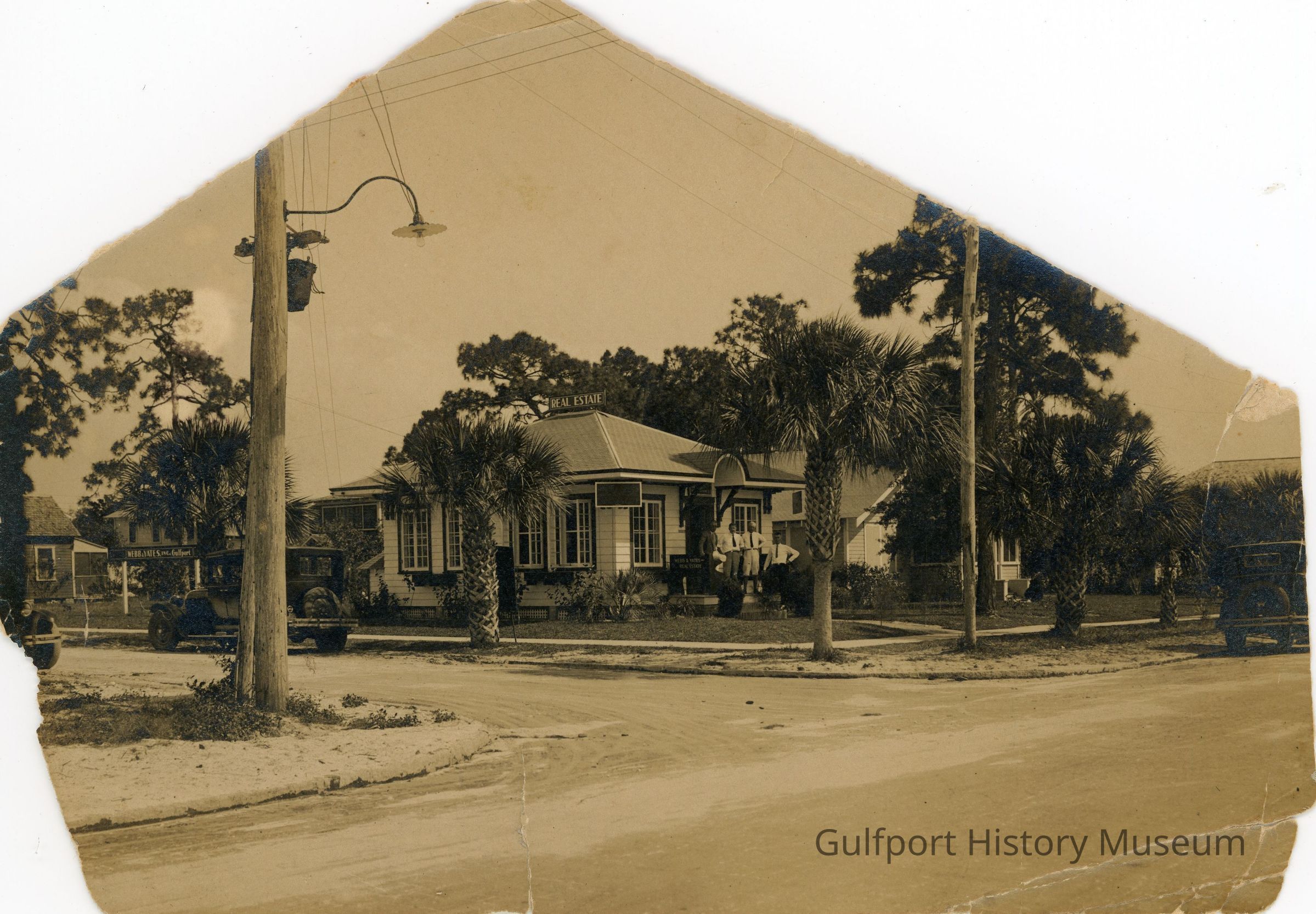 A black and white photograph of four men standing outside of the Webb & Yates Real Estate office at the corner of Beach Blvd S and 29th Ave S, 2092 Beach Blvd S. There is a sign on the roof of the building that reads: "REAL ESTATE," as well as another by the men that says: "WEBB & YATES REAL ESTATE."Photograph Details