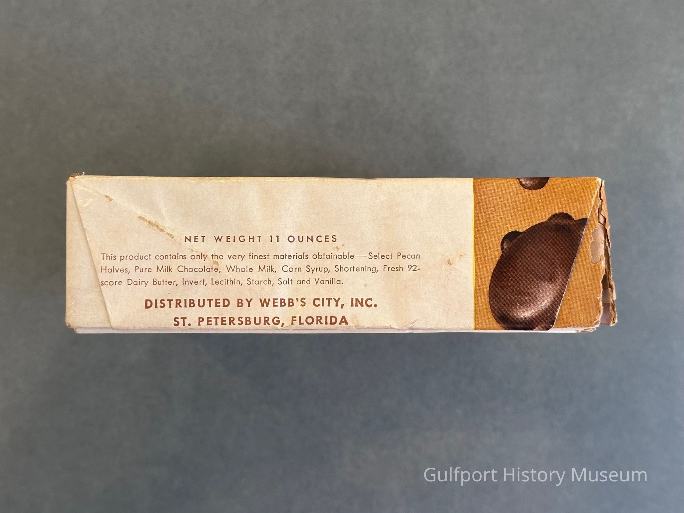 NET WEIGHT 11 OUNCES / This product contains only the very finest materials obtainable - Select Pecan / Halves, Pure Milk Chocolate, Whole Milk, Corn Syrup, Shortening, Fresh 92- / score Dairy Butter, Invert, Lecithin, Starch, Salt and Vanilla. / DISTRIBUTED BY WEBB'S CITY, INC. / ST. PETERSBURG, FLORIDALanguage