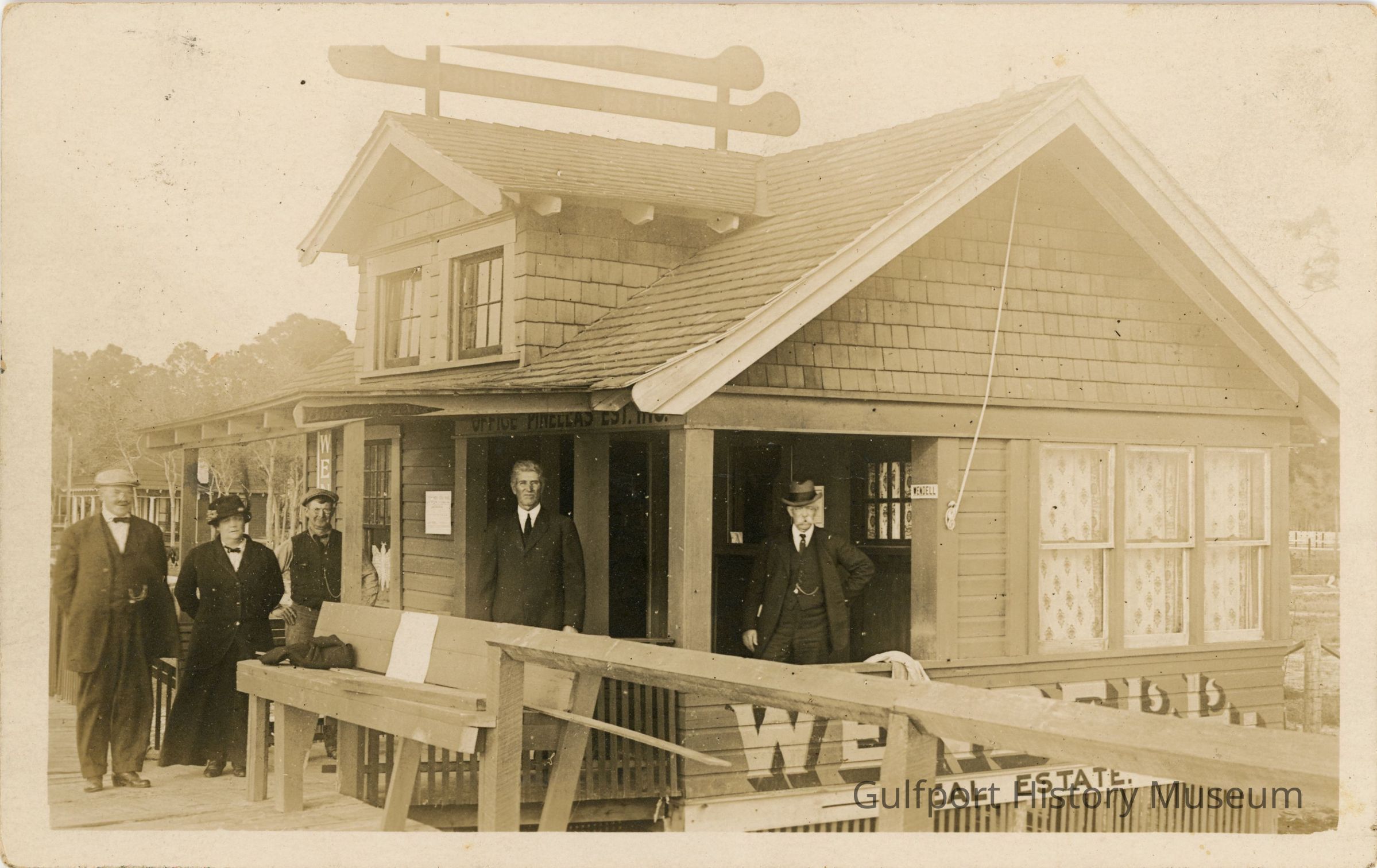 A black and white photograph postcard showing four men and a woman standing outside of Wendell Real Estate, a small building with three windows on the side, a patio, and a bench.Subject