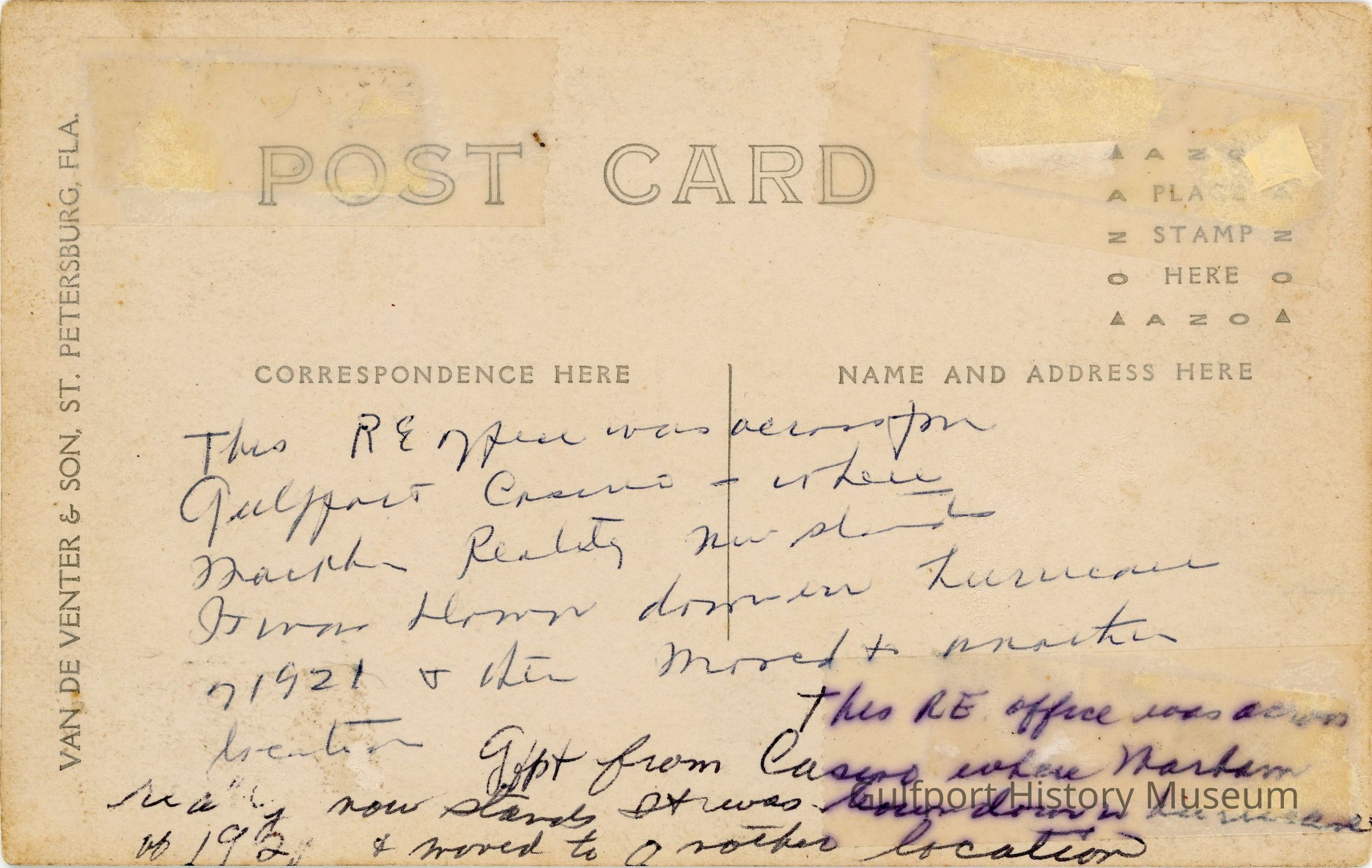 This RE [real estate] office was across from / Gulfport Casino - where / Markham Realty now stands / It was blown down in hurricane / [of] 1921 + then moved to another / location / This RE office was across / Gfpt from Casino where Markham / realty now stands It was blown down in hurricane / of 1921 + moved to another locationTranscriber