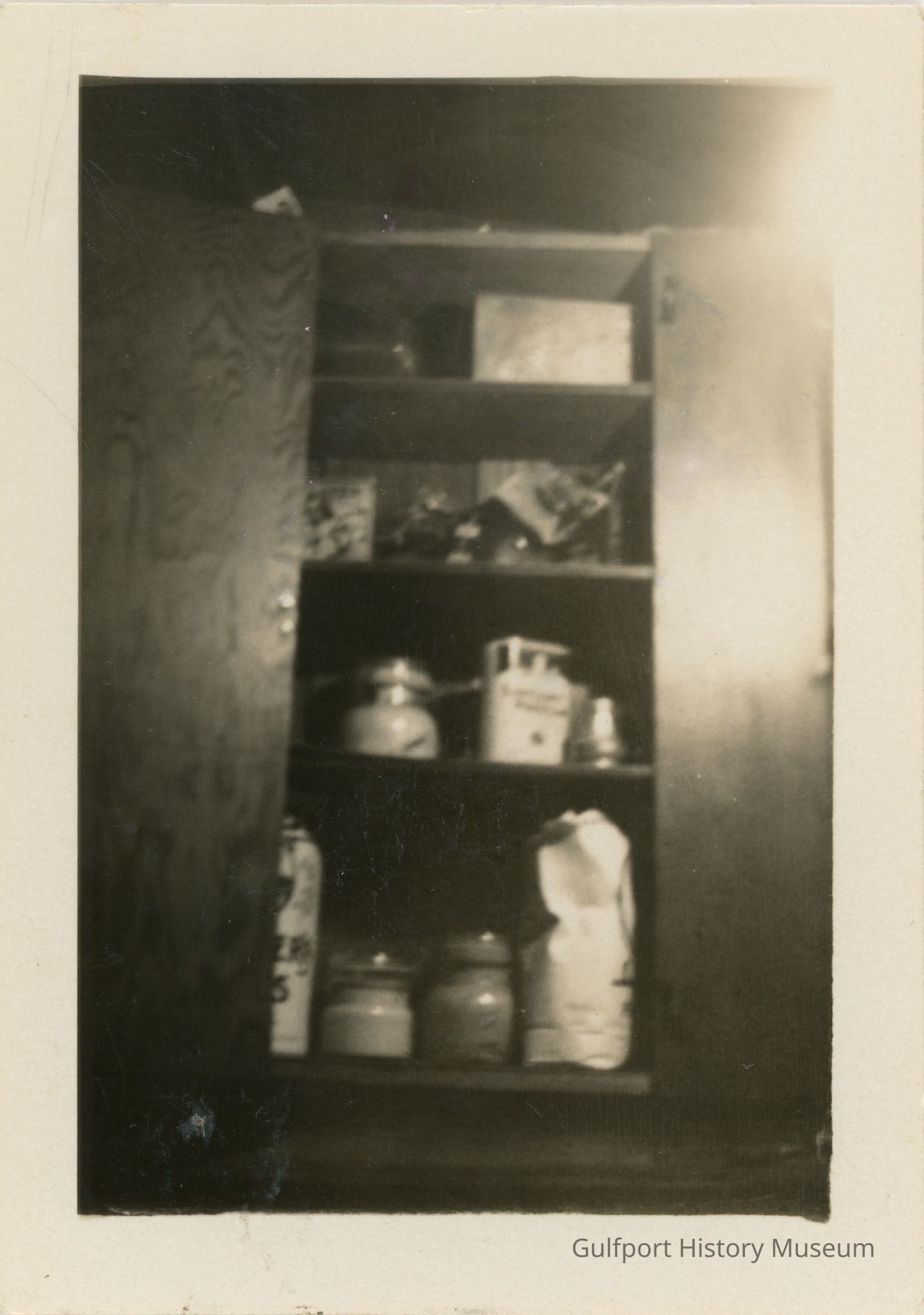 A black and white photograph of an out-of-focus cupboard. Four shelves inside hold various jars, bags, and canisters.