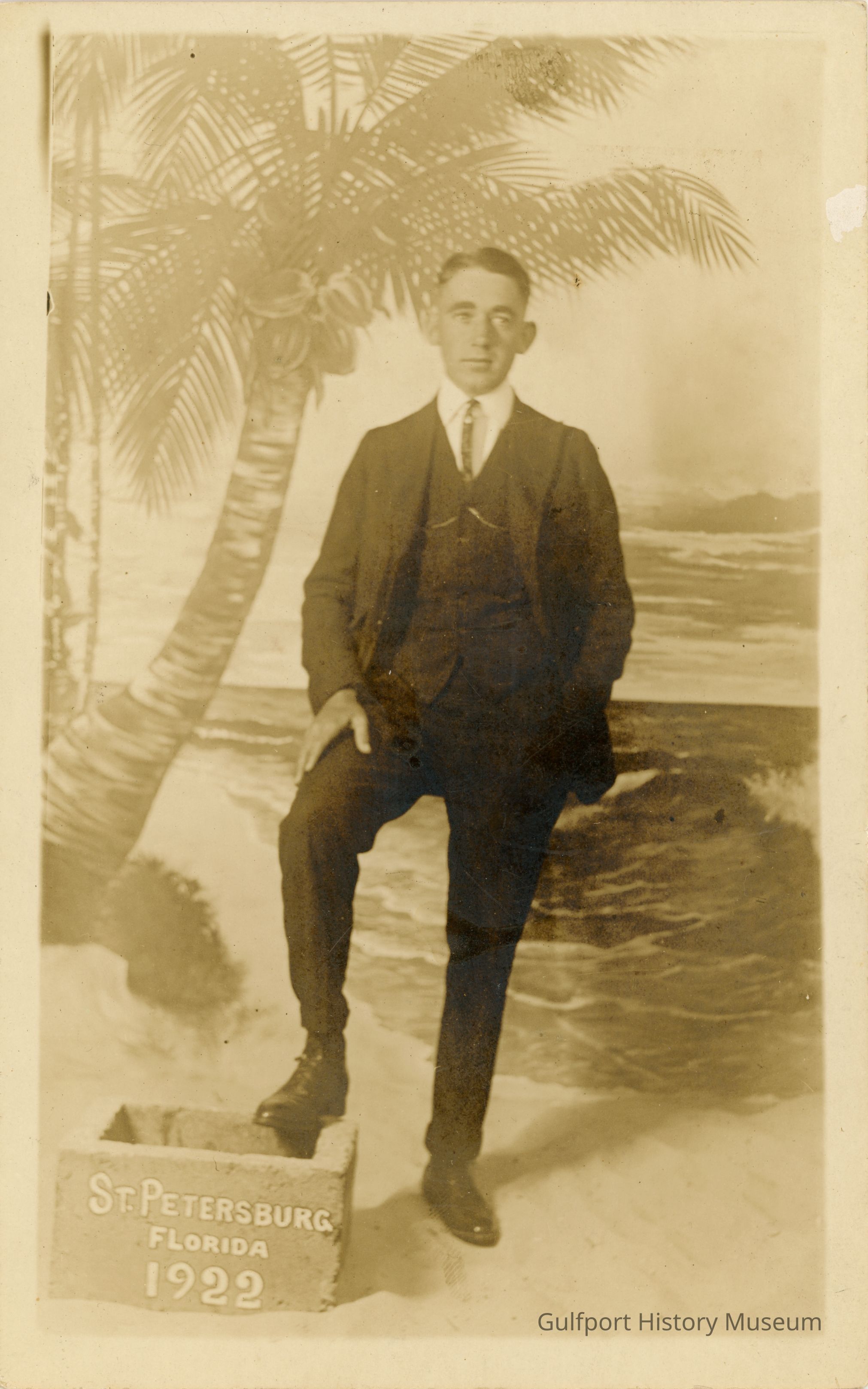 A black and white photographic print of William Schludecker in a suit standing in front of a backdrop painted to look like a beach. One of his legs is resting on a box with text that reads: "ST PETERSBURG FLORIDA 1922."Photograph Details