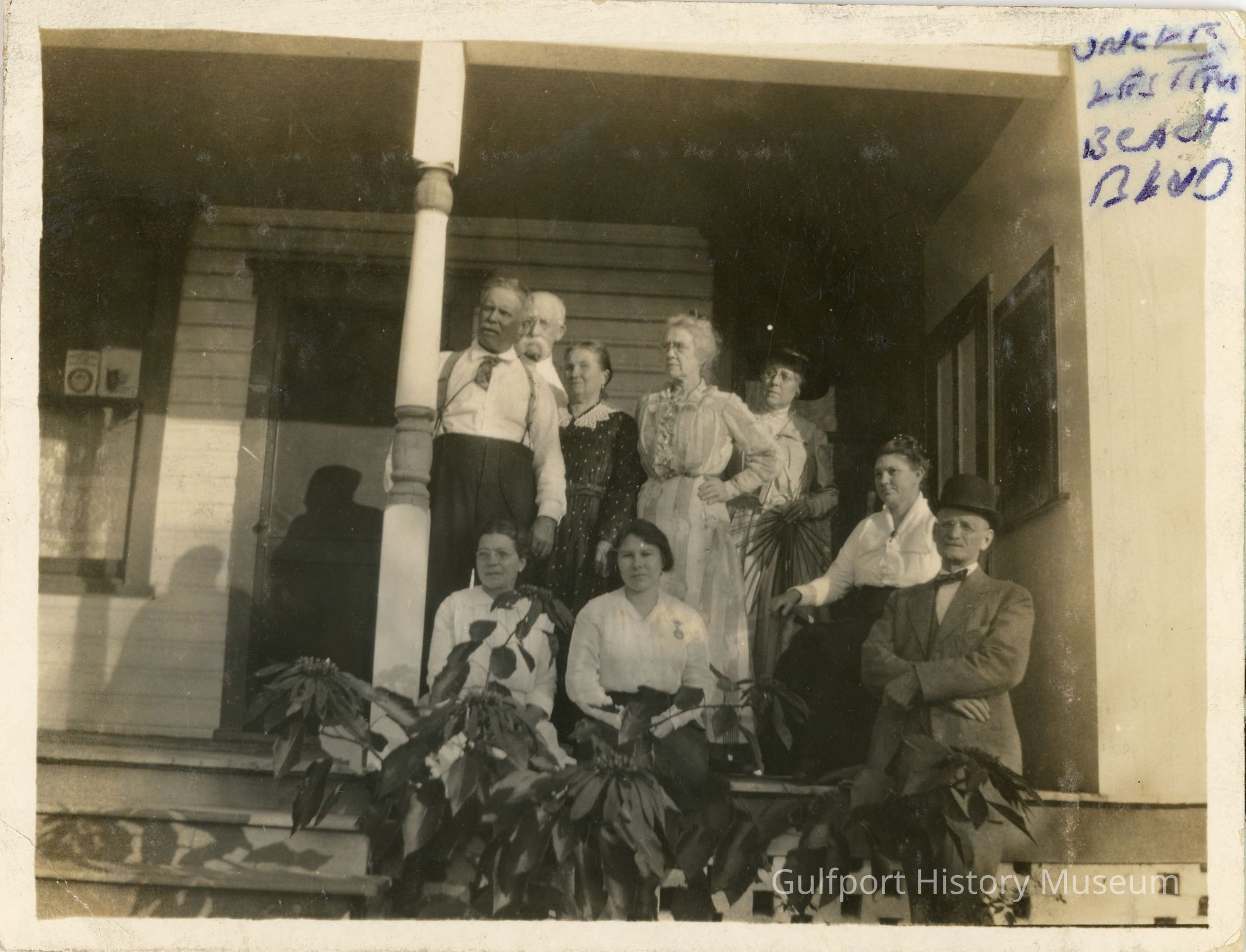 "A gathering of the porch of Lester Wintersgill's home on Beach Boulevard, probably between 1910 and 1920. H.G. Hamm, an early mayor, stands on the left. Wintersgill's daughter Elsie W. Roberts and granddaughter Phyllis Holland are sitting on the steps."