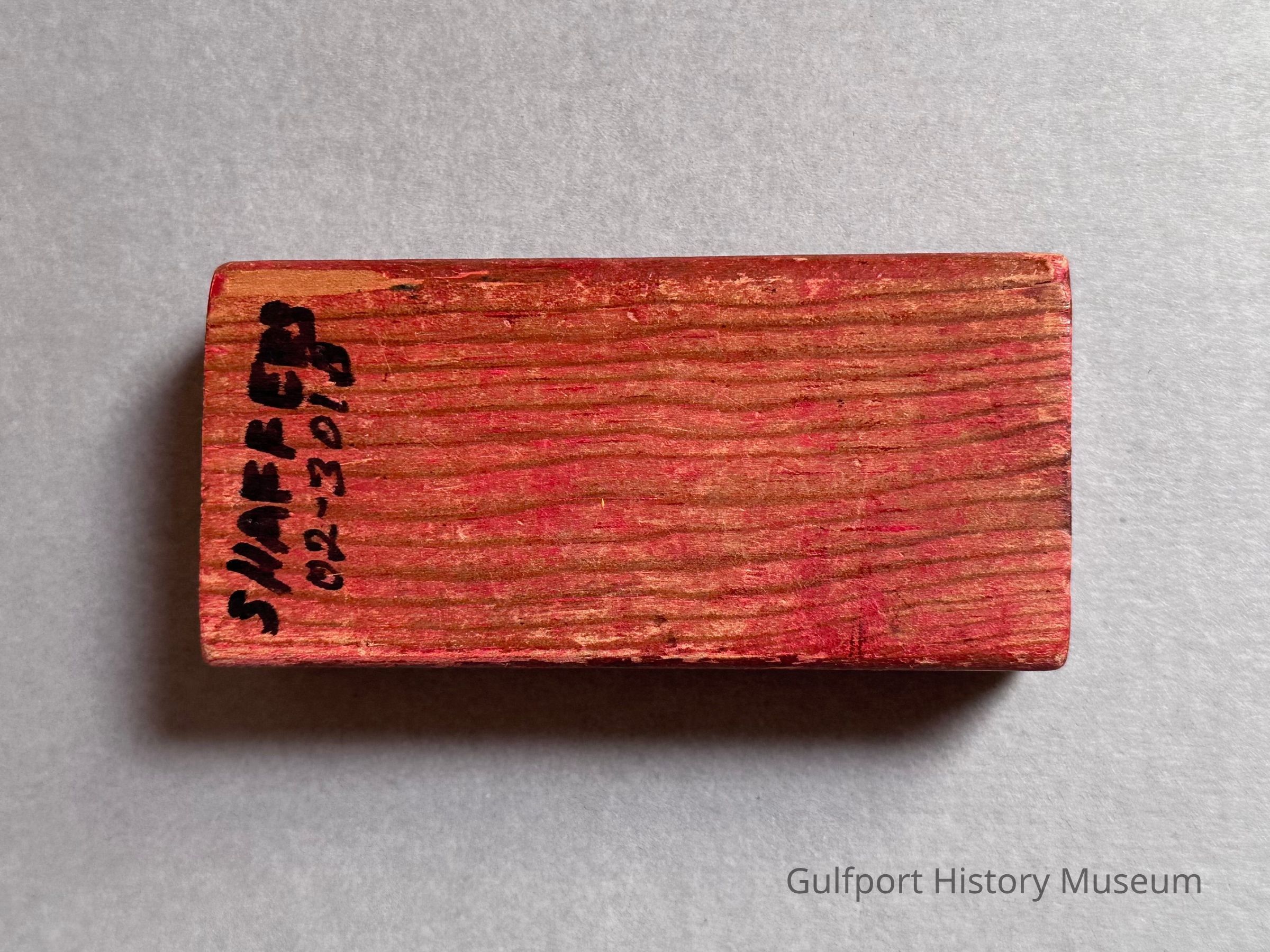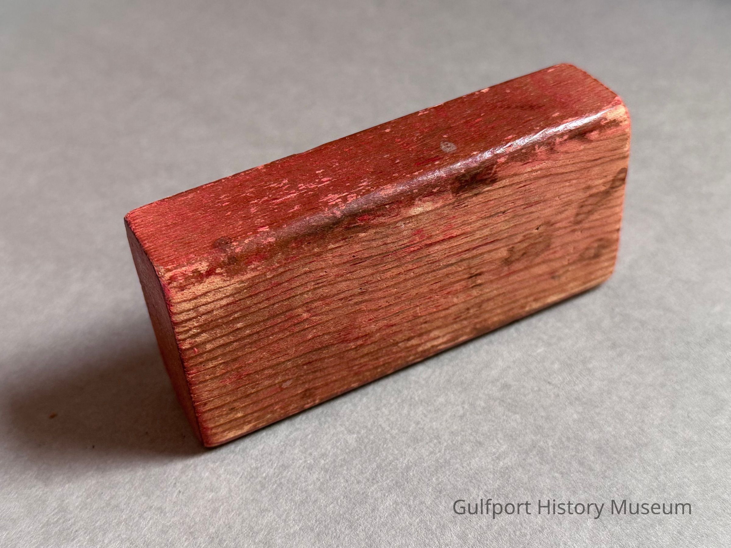 A small wooden toy building block, painted red.