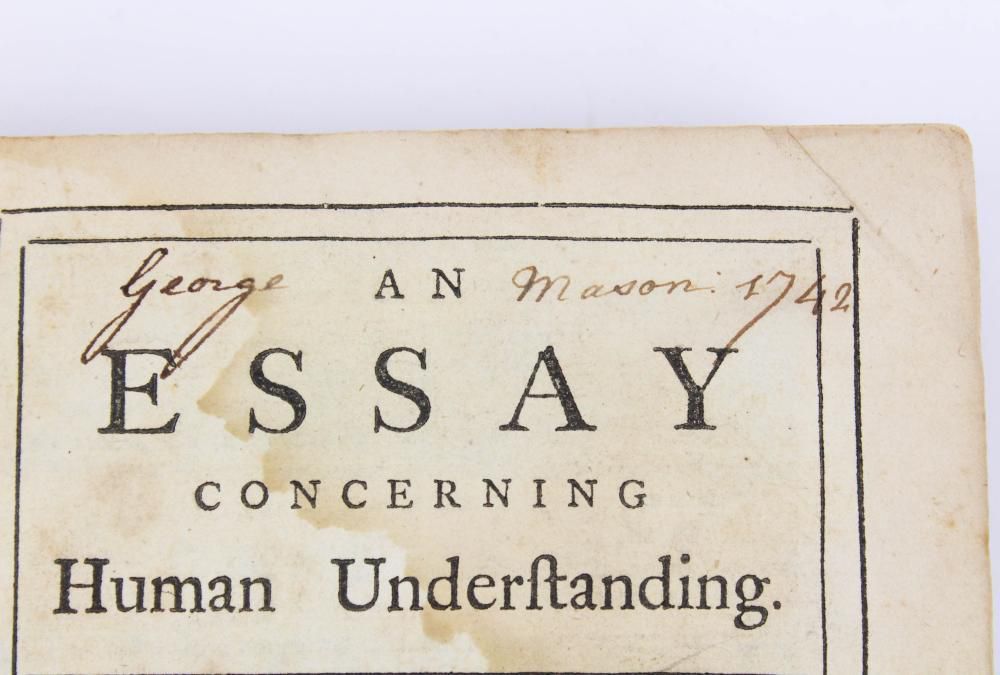 First volume of four in John Locke's series, An Essay Concerning Human Understanding, which was printed in 1741. This was George Mason V's copy and bares his signature. This volume includes 43 chapters, split among three books, that discuss the development of human knowledge. The book includes themes of the mind, power, universal assent, sense experience, truth, identity, and simple or complex ideas.Acquisition