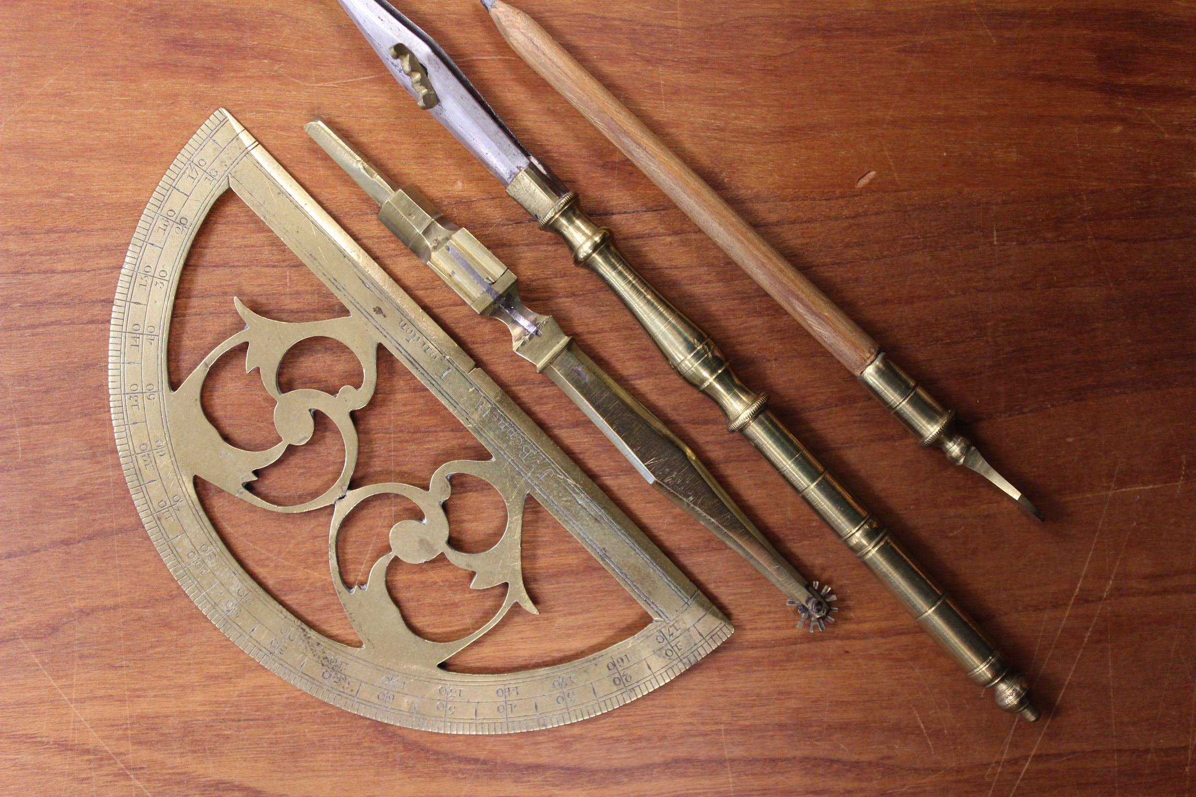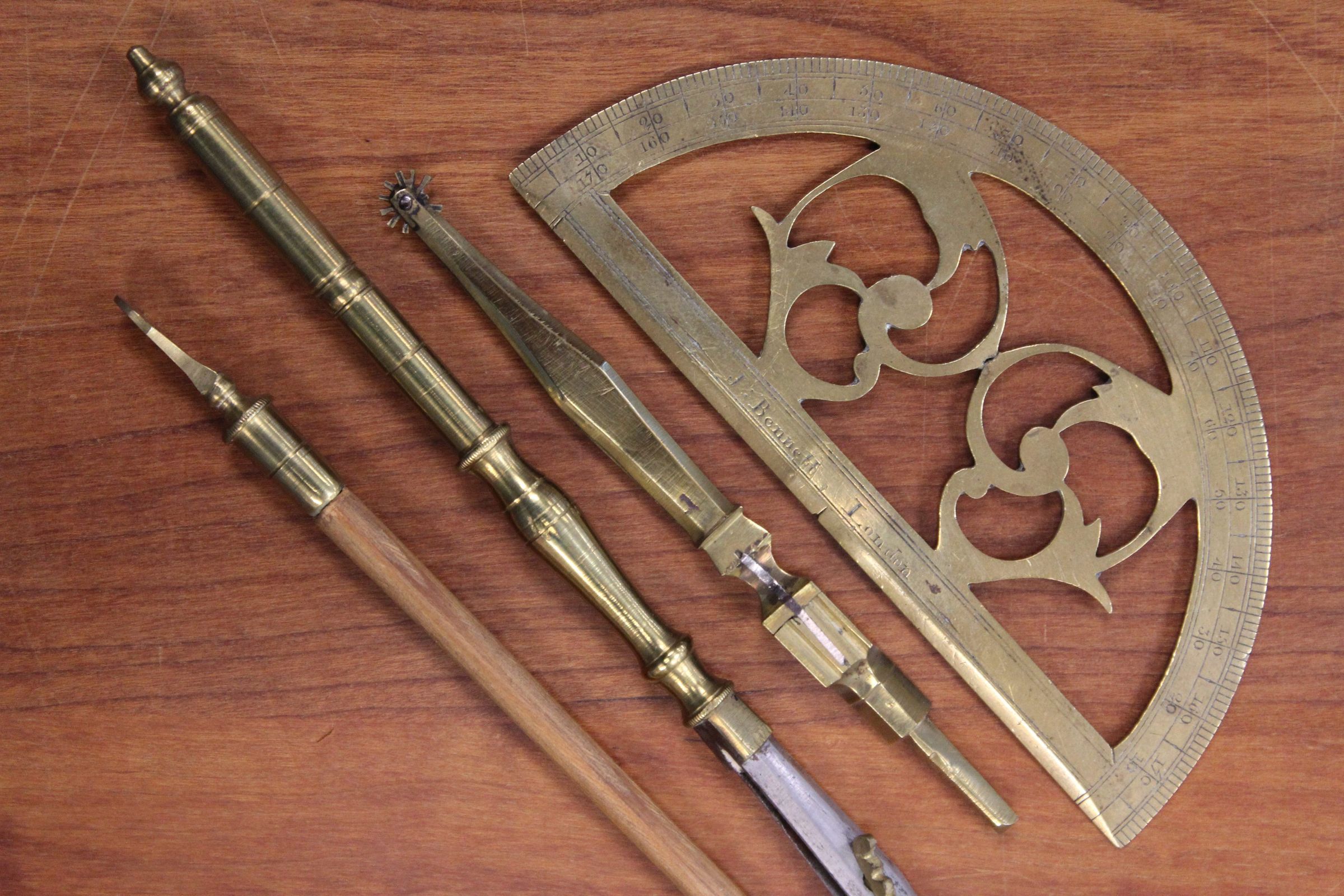 Protractor, brass, maker: John Bennett, London, England, c. 1710, semi-circular pierced, inscribed "J: Bennett, London" across bottom, listed in little sitting roomAcquisition